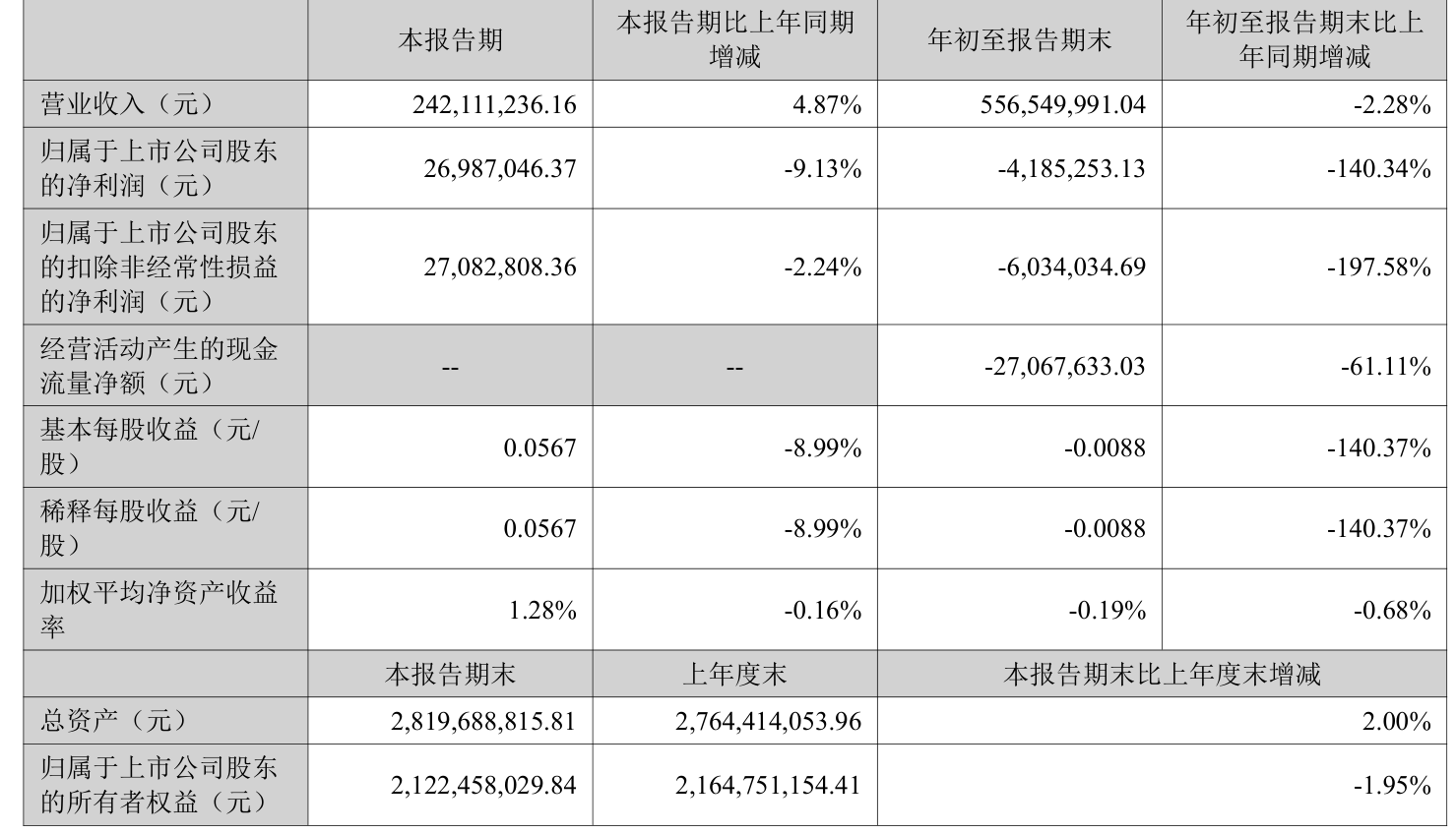 中证智能财讯新开普(300248)10月29日披露2025年第三季度报告。前三季度公司实现营业总收入5.57亿元,同比下降2.28%;归母净利润亏损418.53万元,上年同期盈利1037.56万元;扣非净利润亏损603.4万元,上年同期盈利618.38万元;经营活动产生的现金流量净额为-2706.76万元,上年同期为-1680.07万元;报告期内,新开普基本每股收益为-0.0088元,加权平均净资产收益率为-0.19%。