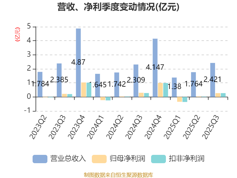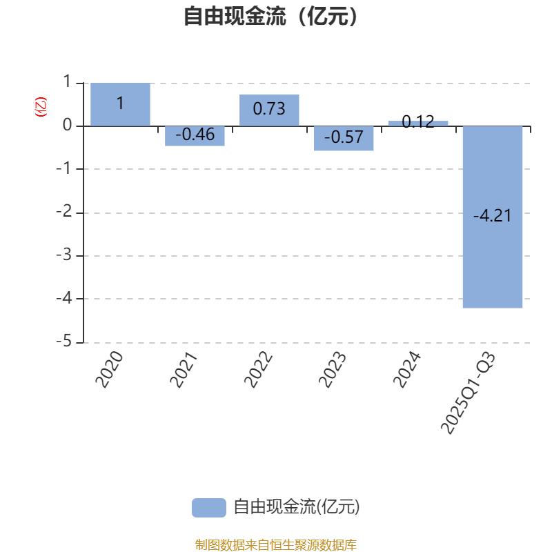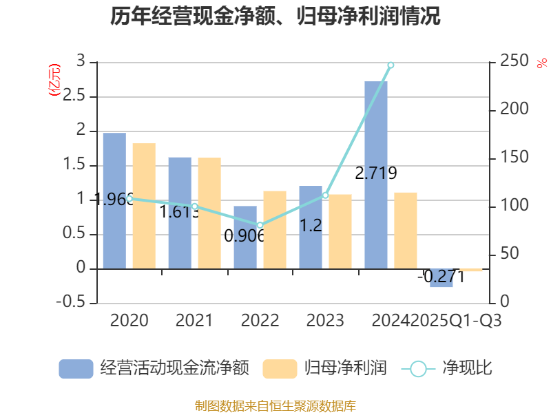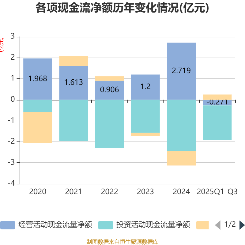2025年前三季度,公司经营活动现金流净额为-2706.76万元,同比减少1026.69万元;筹资活动现金流净额2500.24万元,同比增加7456.23万元;投资活动现金流净额-1.65亿元,上年同期为-1.51亿元。