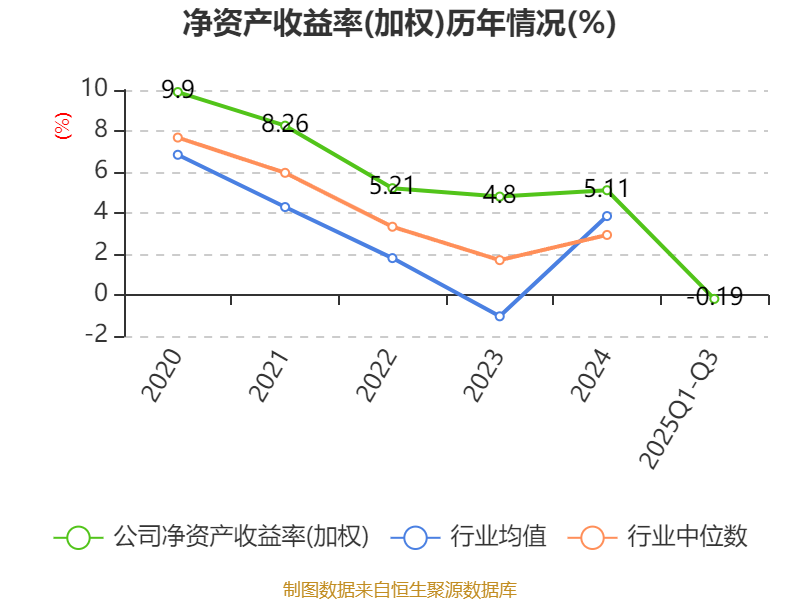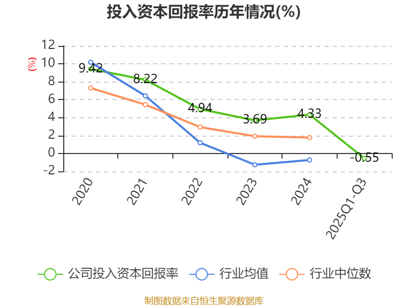 盈利能力方面, 2025年前三季度公司加权平均净资产收益率为-0.19%,同比下降0.68个百分点。公司2025年前三季度投入资本回报率为-0.55%,较上年同期下降0.55个百分点。