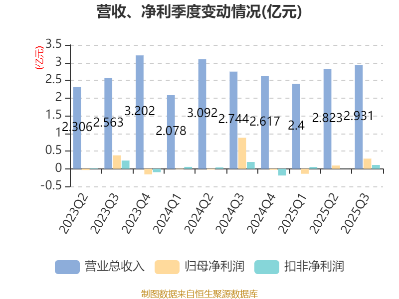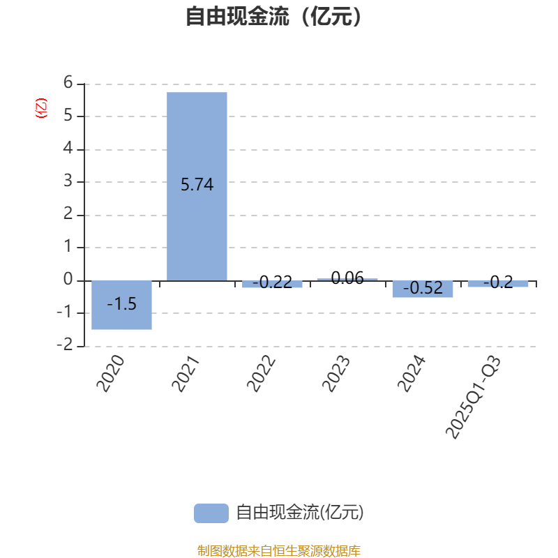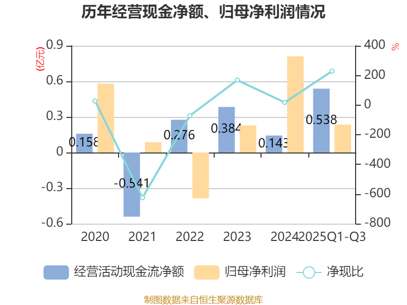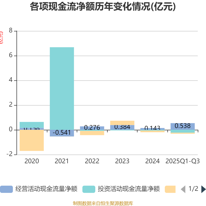 2025年前三季度,公司经营活动现金流净额为5379.87万元,同比增长1282.91%;筹资活动现金流净额-835.52万元,同比减少113.15万元;投资活动现金流净额-2348.26万元,上年同期为-539.47万元。