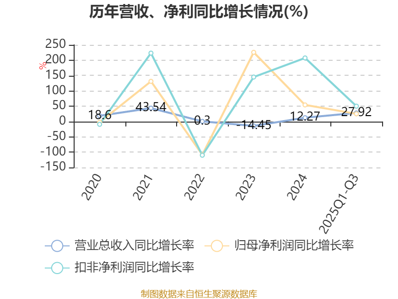 中证智能财讯赞宇科技(002637)10月29日披露2025年第三季度报告。前三季度公司实现营业总收入96.76亿元,同比增长27.92%;归母净利润1.51亿元,同比增长24.96%;扣非净利润1.37亿元,同比增长49.93%;经营活动产生的现金流量净额为6.22亿元,同比增长40.31%;报告期内,赞宇科技基本每股收益为0.33元,加权平均净资产收益率为3.99%。