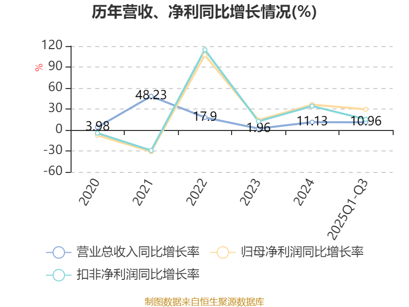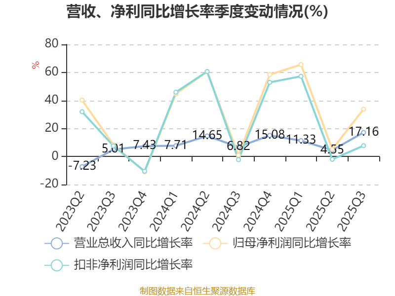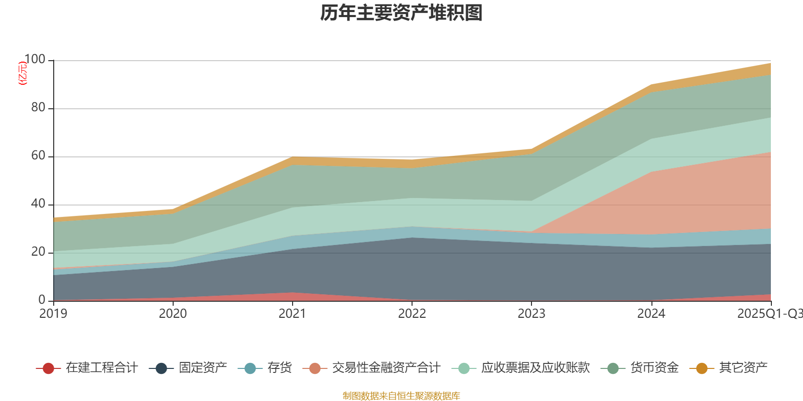 资产重大变化方面,截至2025年三季度末,公司货币资金较上年末减少8%,占公司总资产比重下降3.5个百分点;交易性金融资产合计较上年末增加22.27%,占公司总资产比重上升3.26个百分点;固定资产较上年末减少4%,占公司总资产比重下降3.07个百分点;在建工程合计较上年末增加1046.15%,占公司总资产比重上升2.41个百分点。