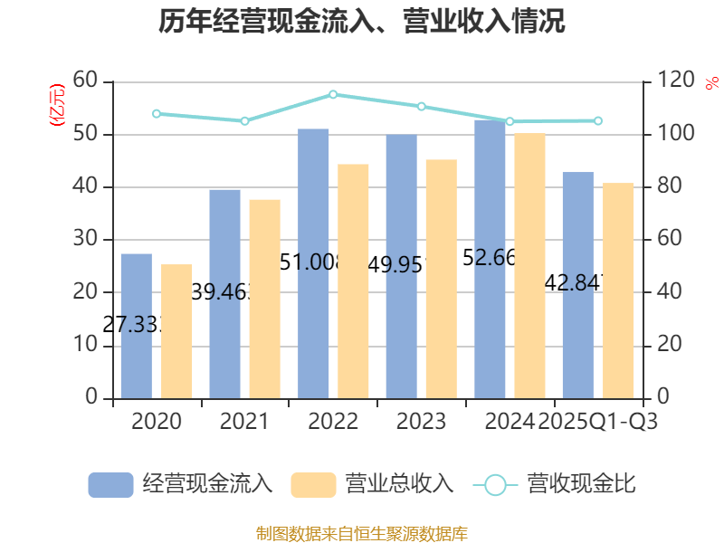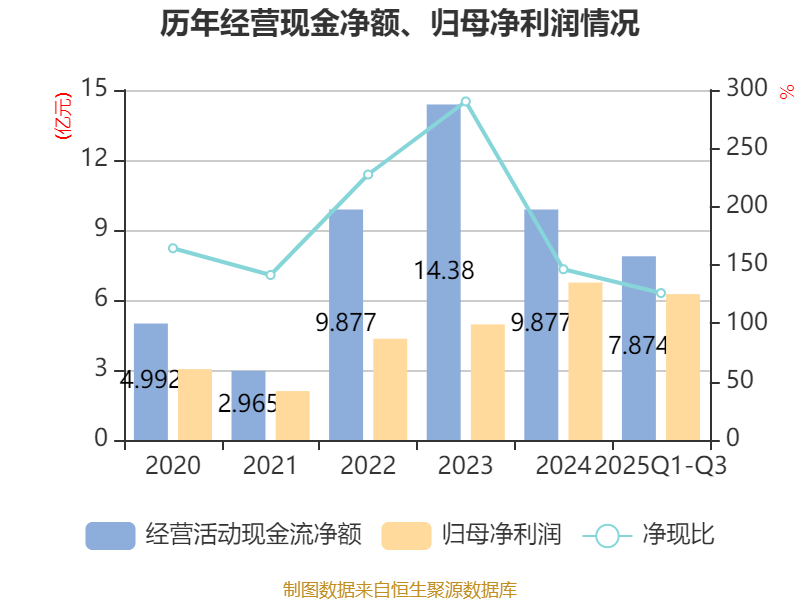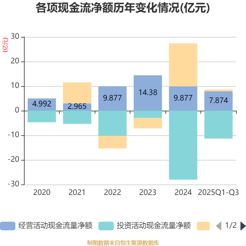 2025年前三季度,公司经营活动现金流净额为7.87亿元,同比下降3.24%;筹资活动现金流净额7224.19万元,同比减少14.42亿元;投资活动现金流净额-11.34亿元,上年同期为-24.03亿元。