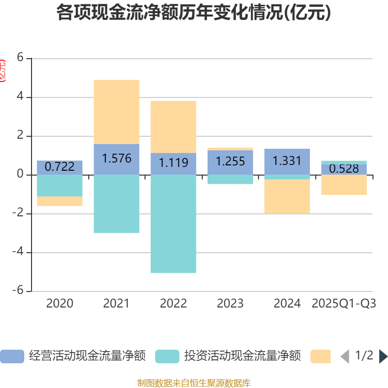 2025年前三季度,公司经营活动现金流净额为5279.4万元,同比增长75.26%;筹资活动现金流净额-1.05亿元,同比增加5186.27万元;投资活动现金流净额1814.77万元,上年同期为4123.51万元。