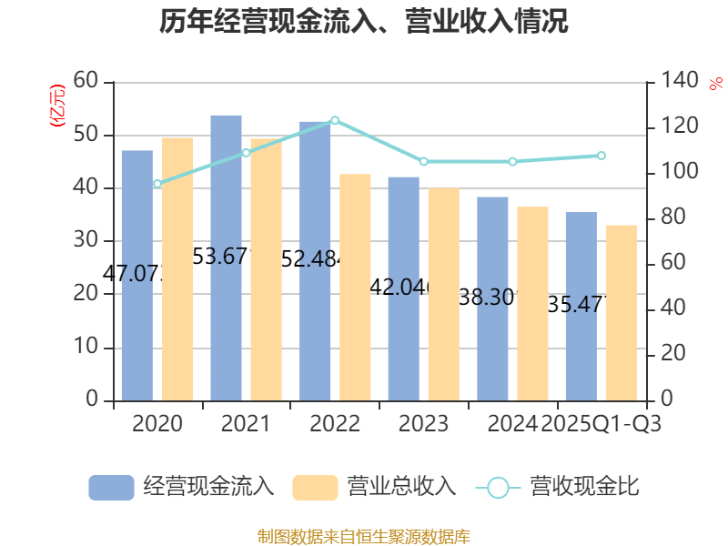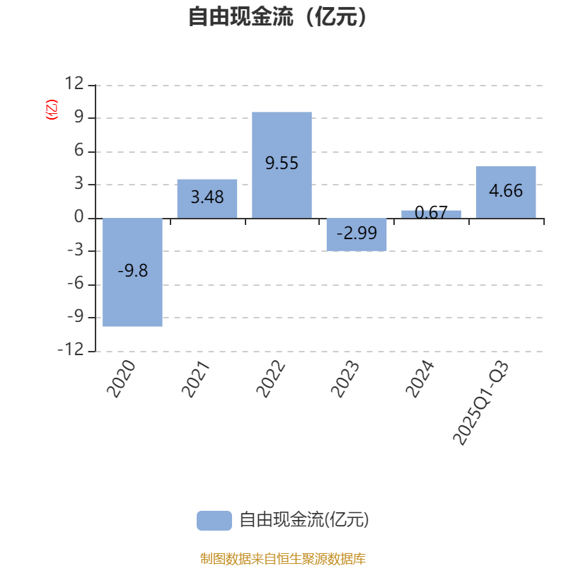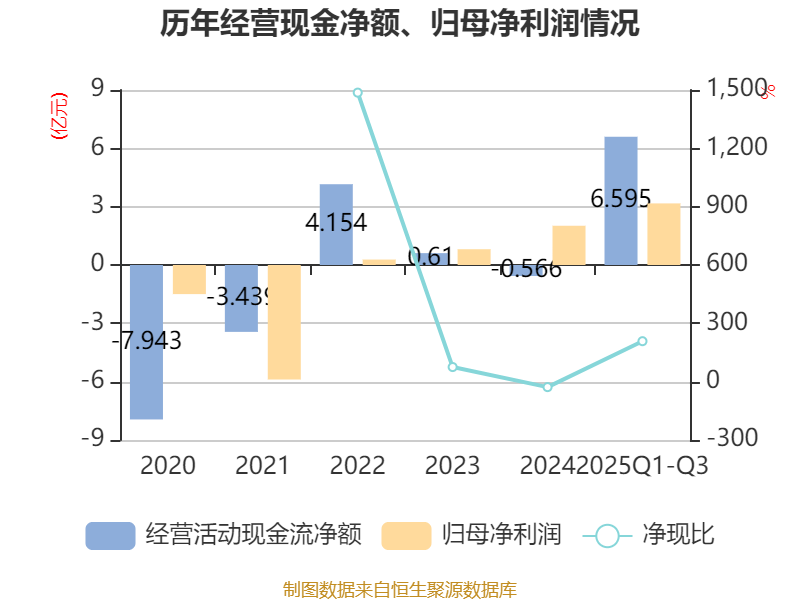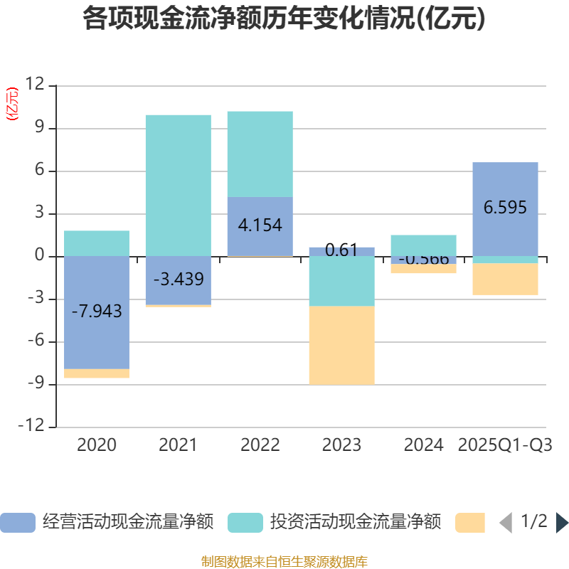 2025年前三季度,公司经营活动现金流净额为6.59亿元,同比增长390.74%;筹资活动现金流净额-2.23亿元,同比减少1.59亿元;投资活动现金流净额-5198.19万元,上年同期为1.68亿元。