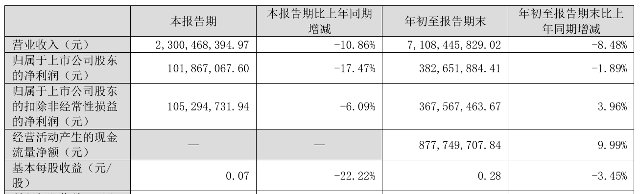 10月28日晚间,红旗连锁(002697)发布2025年三季报,公司前三季度实现营业收入71.08亿元,同比下降8.48%;净利润3.83亿元,同比下降1.89%;扣非后净利润则为3.68亿元,同比增长3.96%。