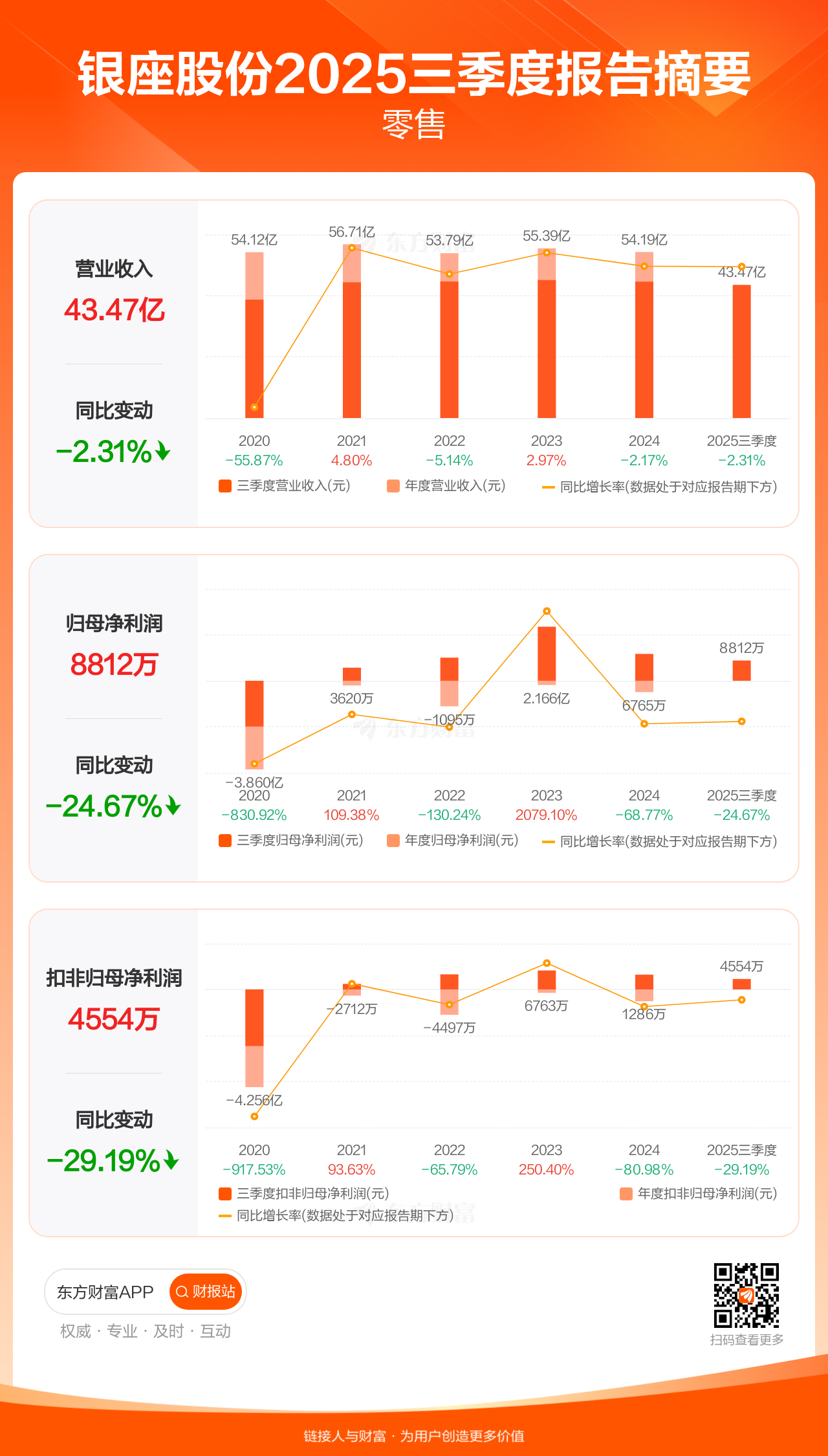 银座股份10月29日发布2025年三季报显示,公司前三季实现营业收入43.47亿元,同比下滑2.31%;归母净利润8812.15万元,同比下滑24.67%;扣非归母净利润4554.20万元,同比下滑29.19%。