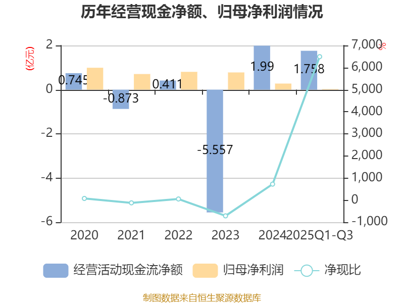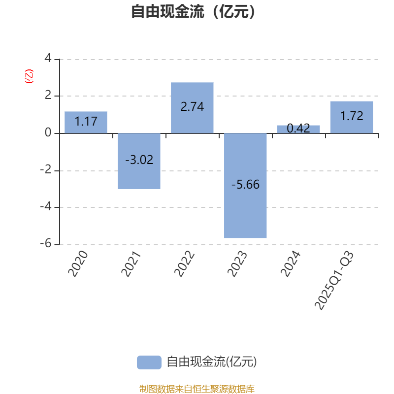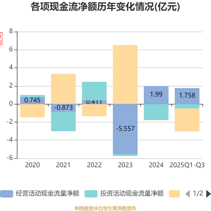 2025年前三季度,公司经营活动现金流净额为1.76亿元,同比增长156.51%;筹资活动现金流净额-2.54亿元,同比减少1.69亿元;投资活动现金流净额-5054.2万元,上年同期为-1.2亿元。