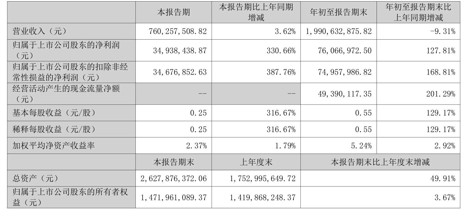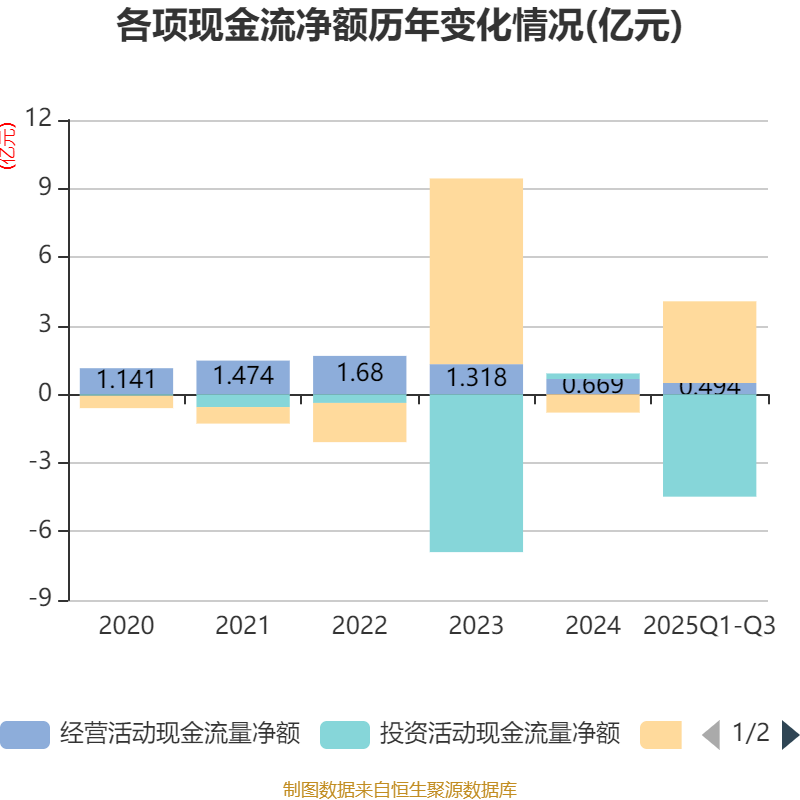 2025年前三季度,公司经营活动现金流净额为4939.01万元,同比增加9815.03万元;筹资活动现金流净额3.57亿元,同比增加4.29亿元;投资活动现金流净额-4.48亿元,上年同期为2.03亿元。