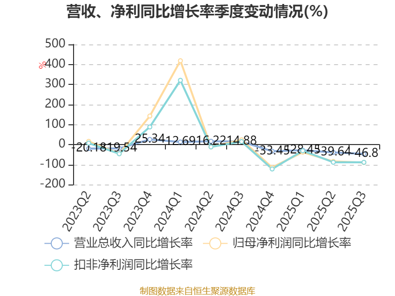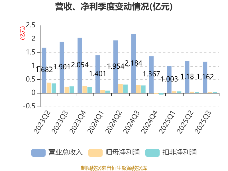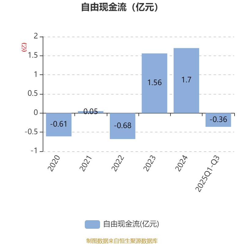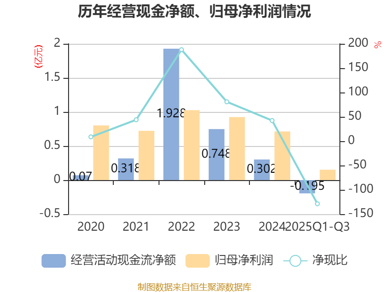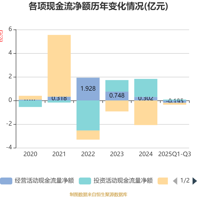 2025年前三季度,公司经营活动现金流净额为-1951.58万元,同比减少5373.82万元;筹资活动现金流净额-1632.38万元,同比增加1.24亿元;投资活动现金流净额782.01万元,上年同期为8250.68万元。
