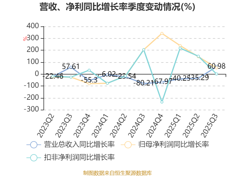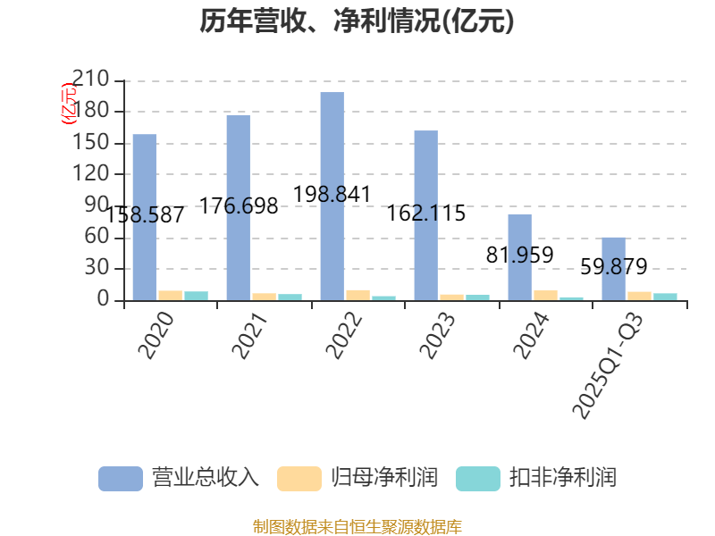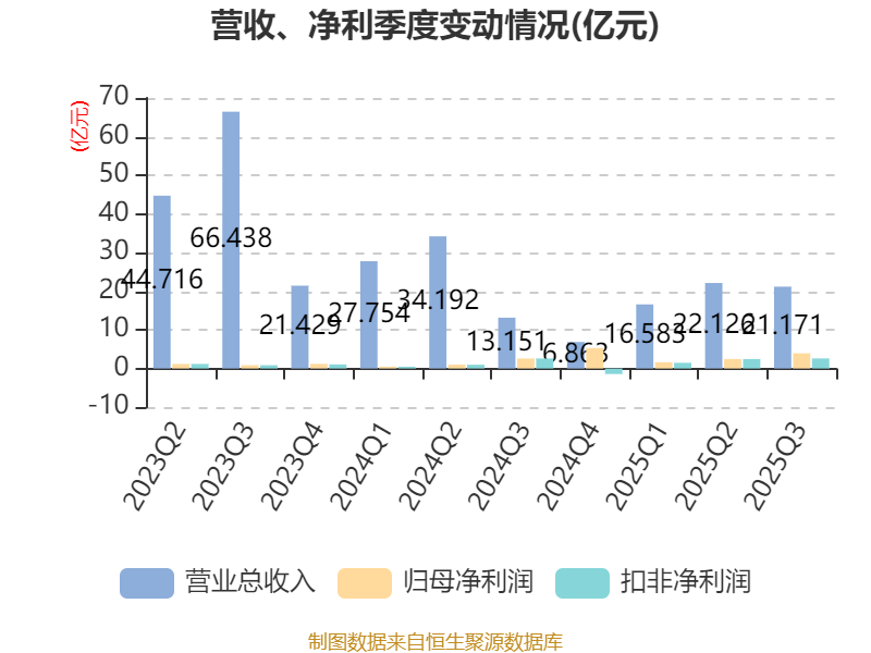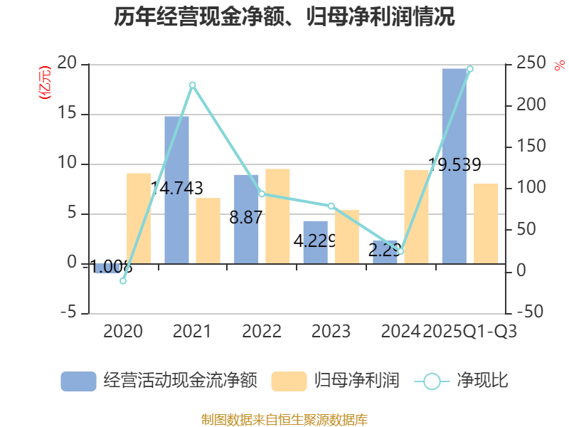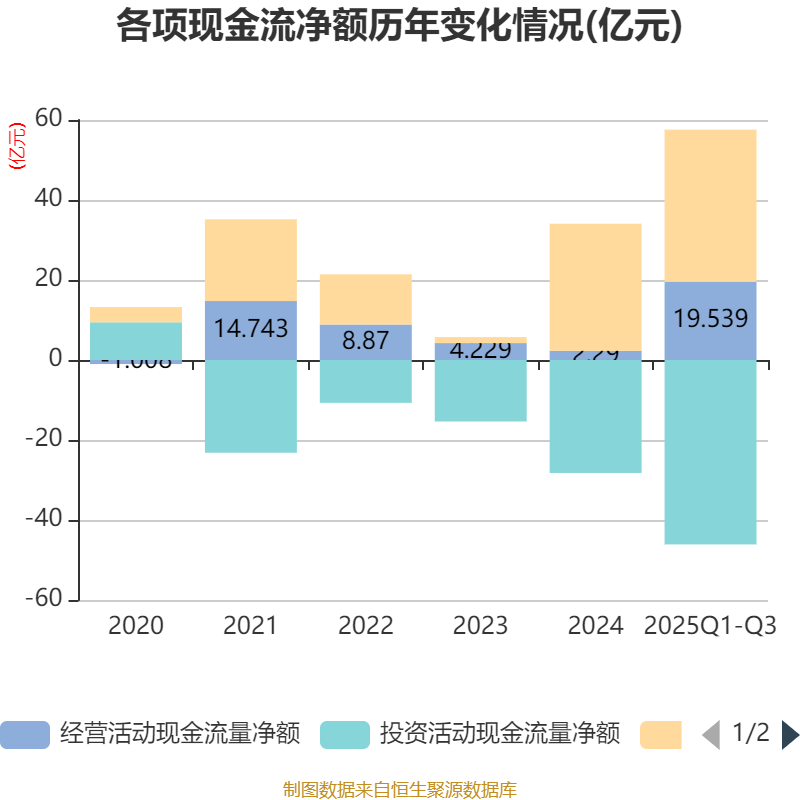 2025年前三季度,公司经营活动现金流净额为19.54亿元,同比下降15.08%;筹资活动现金流净额38.04亿元,同比增加28.41亿元;投资活动现金流净额-46.1亿元,上年同期为-30.23亿元。