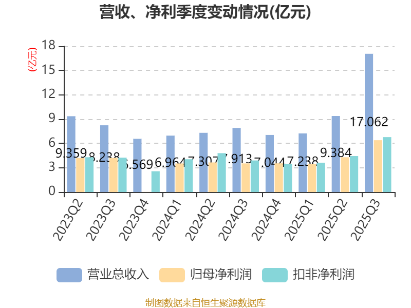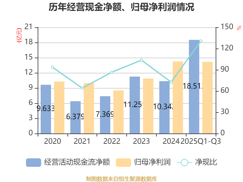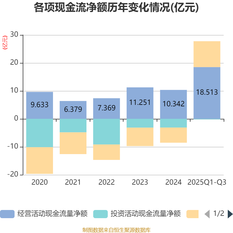 2025年前三季度,公司经营活动现金流净额为18.51亿元,同比增长151.9%;筹资活动现金流净额9.25亿元,同比增加14.26亿元;投资活动现金流净额-1900.31万元,上年同期为-2.69亿元。