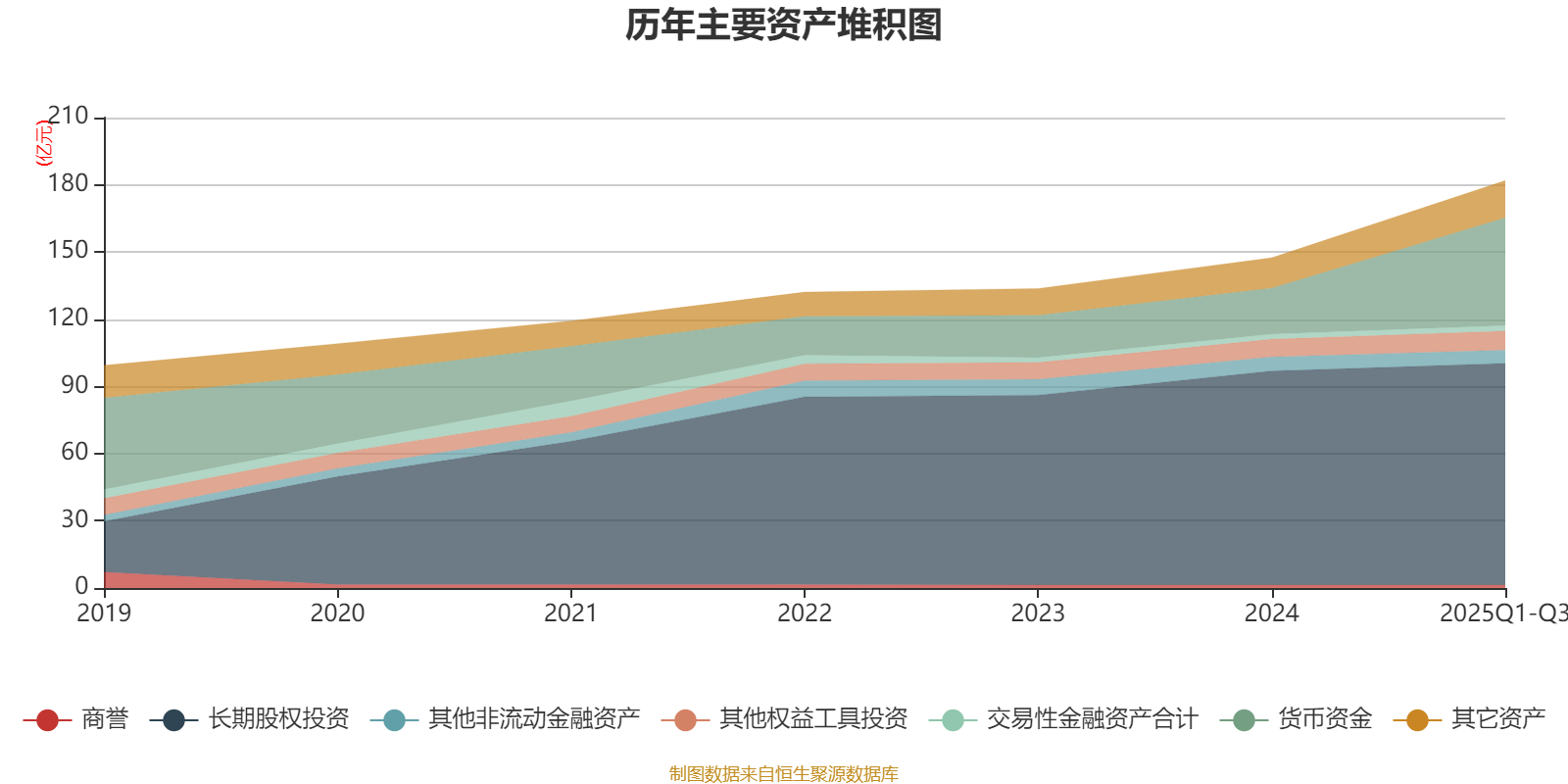 资产重大变化方面,截至2025年三季度末,公司货币资金较上年末增加133.93%,占公司总资产比重上升12.51个百分点;长期股权投资较上年末增加3.57%,占公司总资产比重下降10.41个百分点;其他非流动金融资产较上年末减少6.03%,占公司总资产比重下降1.02个百分点;其他权益工具投资较上年末增加7.96%,占公司总资产比重下降0.67个百分点。