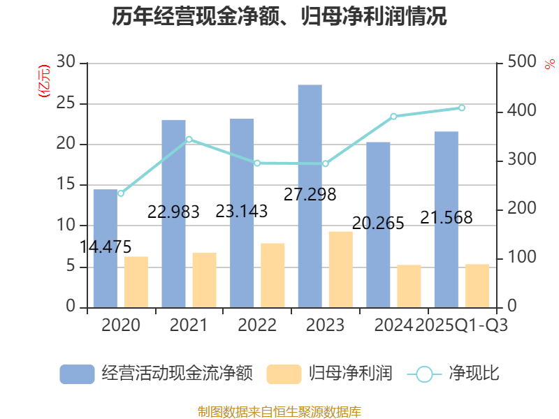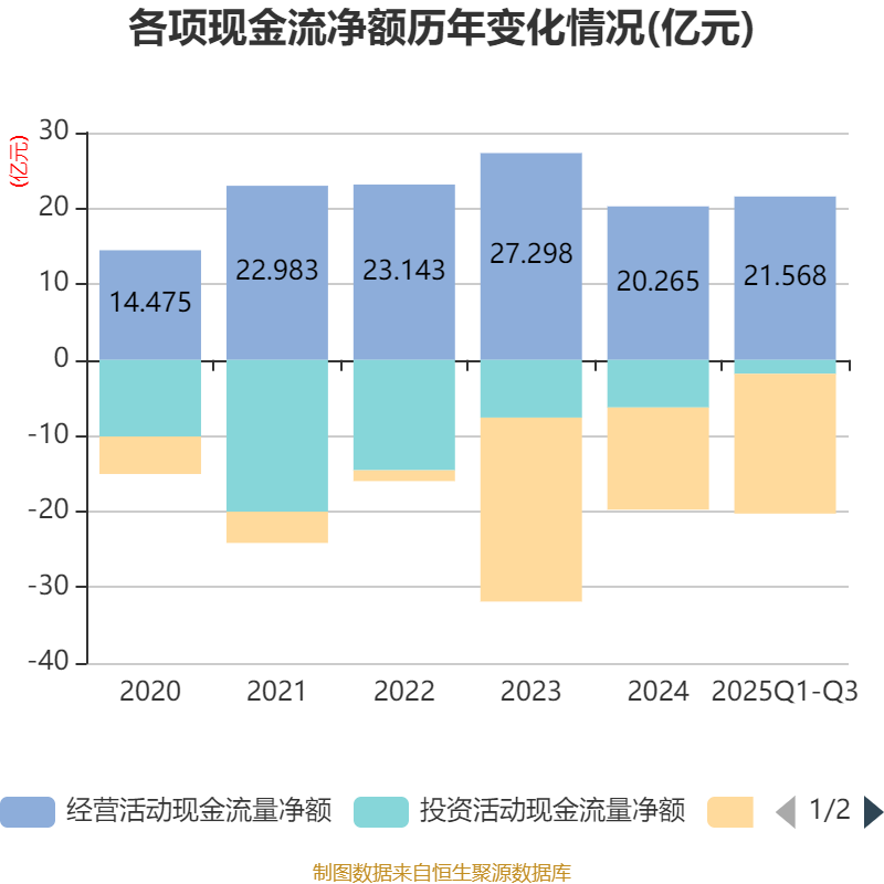 2025年前三季度,公司经营活动现金流净额为21.57亿元,同比增长71.76%;筹资活动现金流净额-18.45亿元,同比减少10.44亿元;投资活动现金流净额-1.83亿元,上年同期为-4.39亿元。