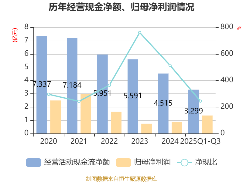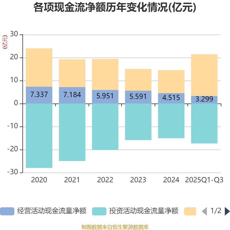 2025年前三季度,公司经营活动现金流净额为3.3亿元,同比下降9.06%;筹资活动现金流净额18.11亿元,同比增加11.18亿元;投资活动现金流净额-17.35亿元,上年同期为-10.27亿元。