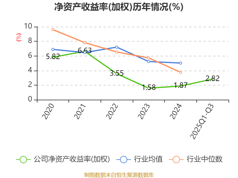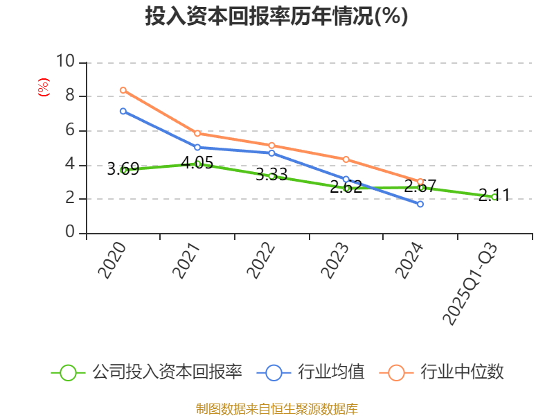 盈利能力方面, 2025年前三季度公司加权平均净资产收益率为2.82%,同比上升0.06个百分点。公司2025年前三季度投入资本回报率为2.11%,较上年同期下降0.24个百分点。