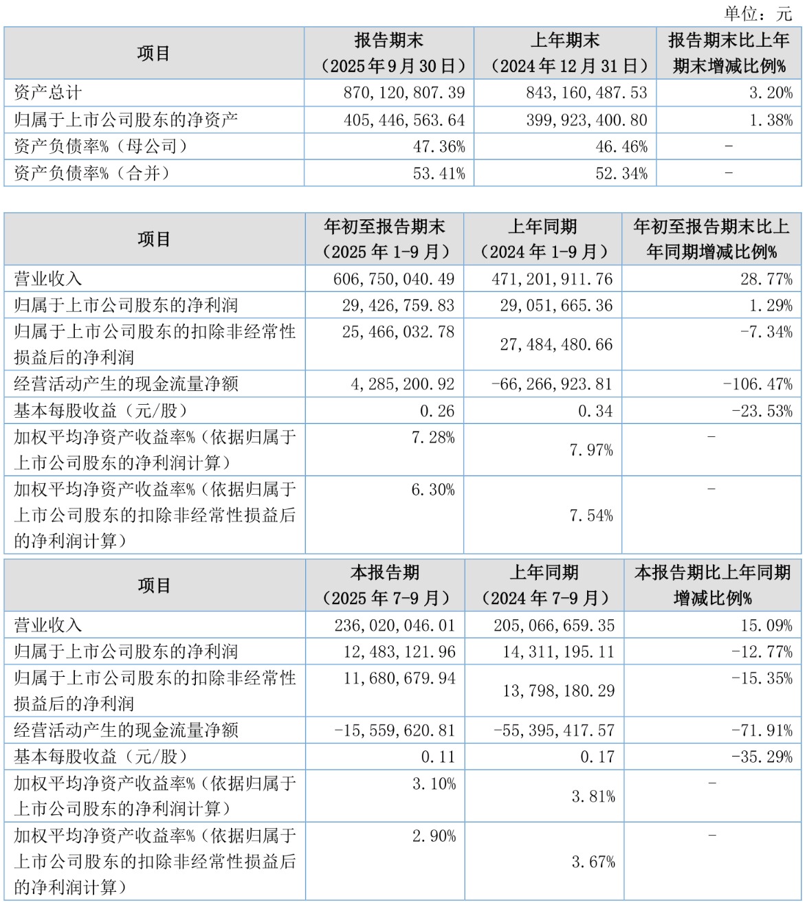 负债重大变化方面,截至2025年三季度末,公司应付票据及应付账款较上年末增加11.92%,占公司总资产比重上升1.18个百分点;合同负债较上年末减少33.93%,占公司总资产比重下降0.94个百分点;一年内到期的非流动负债较上年末增加41.46%,占公司总资产比重上升0.81个百分点;其他应付款(含利息和股利)较上年末减少8.99%,占公司总资产比重下降0.73个百分点。