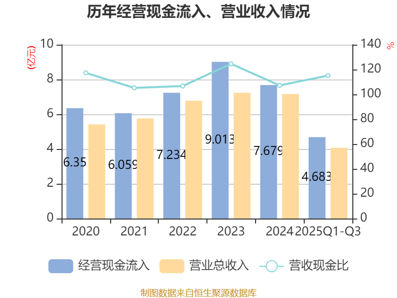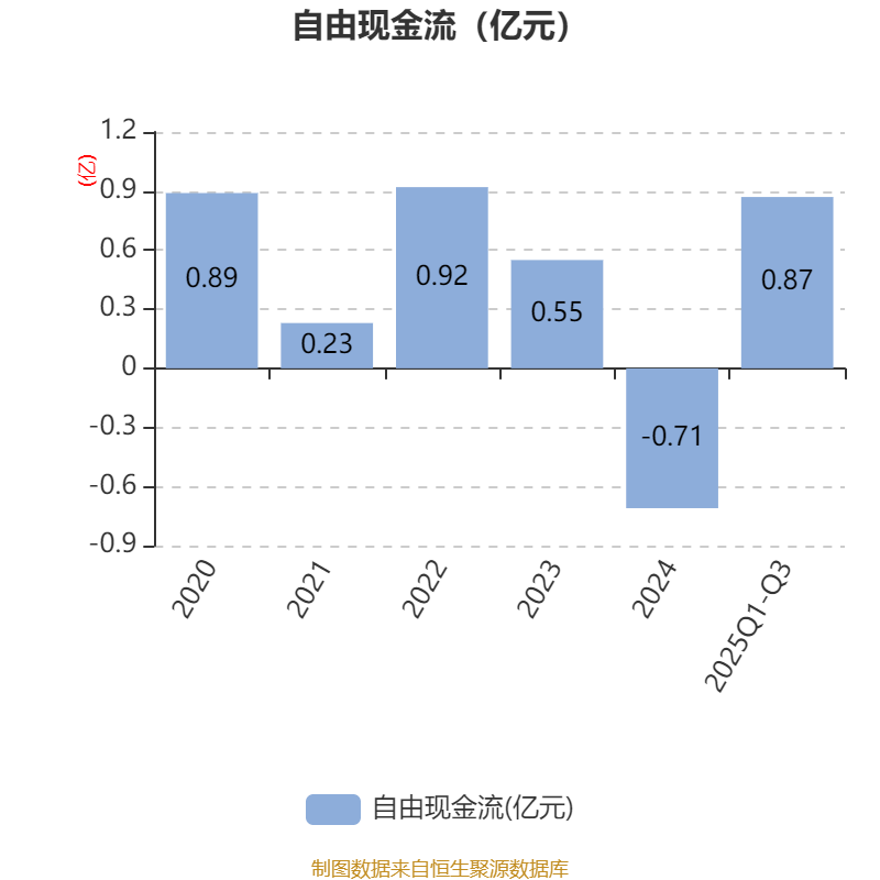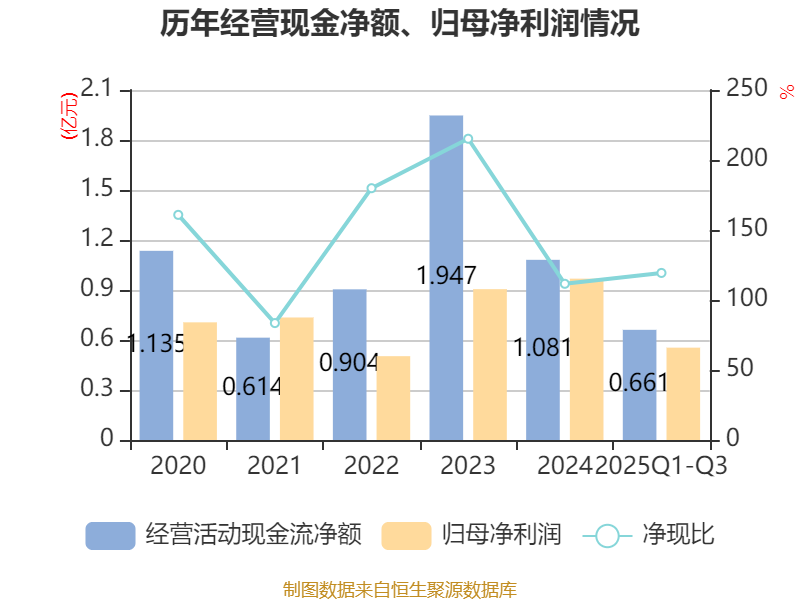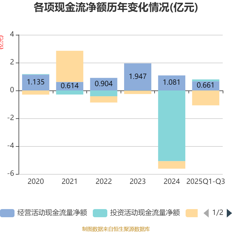2025年前三季度,公司经营活动现金流净额为6614.81万元,同比下降10.82%;筹资活动现金流净额-1.07亿元,同比减少5285.05万元;投资活动现金流净额1339.77万元,上年同期为-3.79亿元。