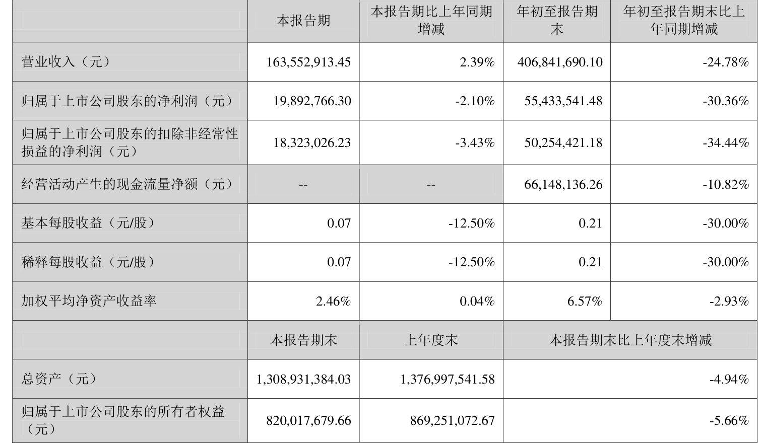 中证智能财讯森赫股份(301056)10月29日披露2025年第三季度报告。前三季度公司实现营业总收入4.07亿元,同比下降24.78%;归母净利润5543.35万元,同比下降30.36%;扣非净利润5025.44万元,同比下降34.44%;经营活动产生的现金流量净额为6614.81万元,同比下降10.82%;报告期内,森赫股份基本每股收益为0.21元,加权平均净资产收益率为6.57%。