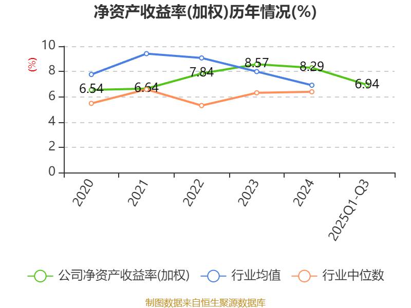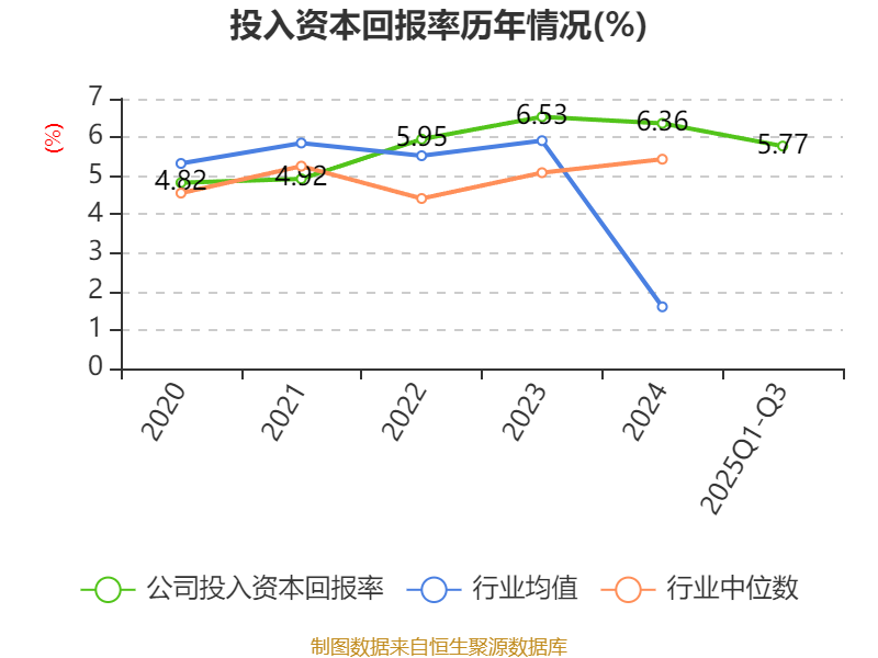 盈利能力方面, 2025年前三季度公司加权平均净资产收益率为6.94%,同比下降0.14个百分点。公司2025年前三季度投入资本回报率为5.77%,较上年同期上升0.3个百分点。