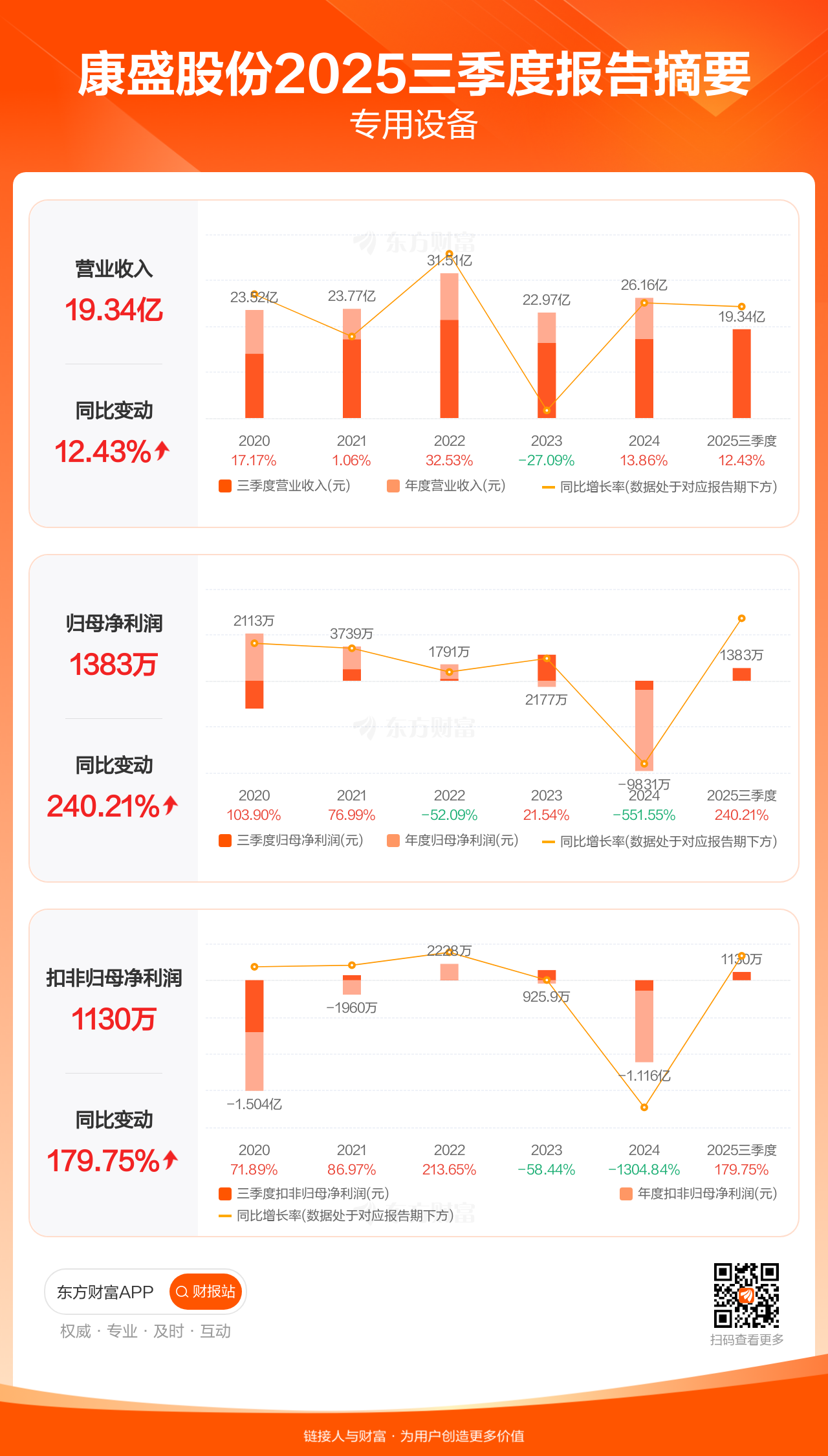 康盛股份10月29日发布2025年三季报显示,公司前三季实现营业收入19.34亿元,同比增长12.43%;归母净利润1383.28万元,同比增长240.21%;扣非归母净利润1129.85万元,同比增长179.75%。
