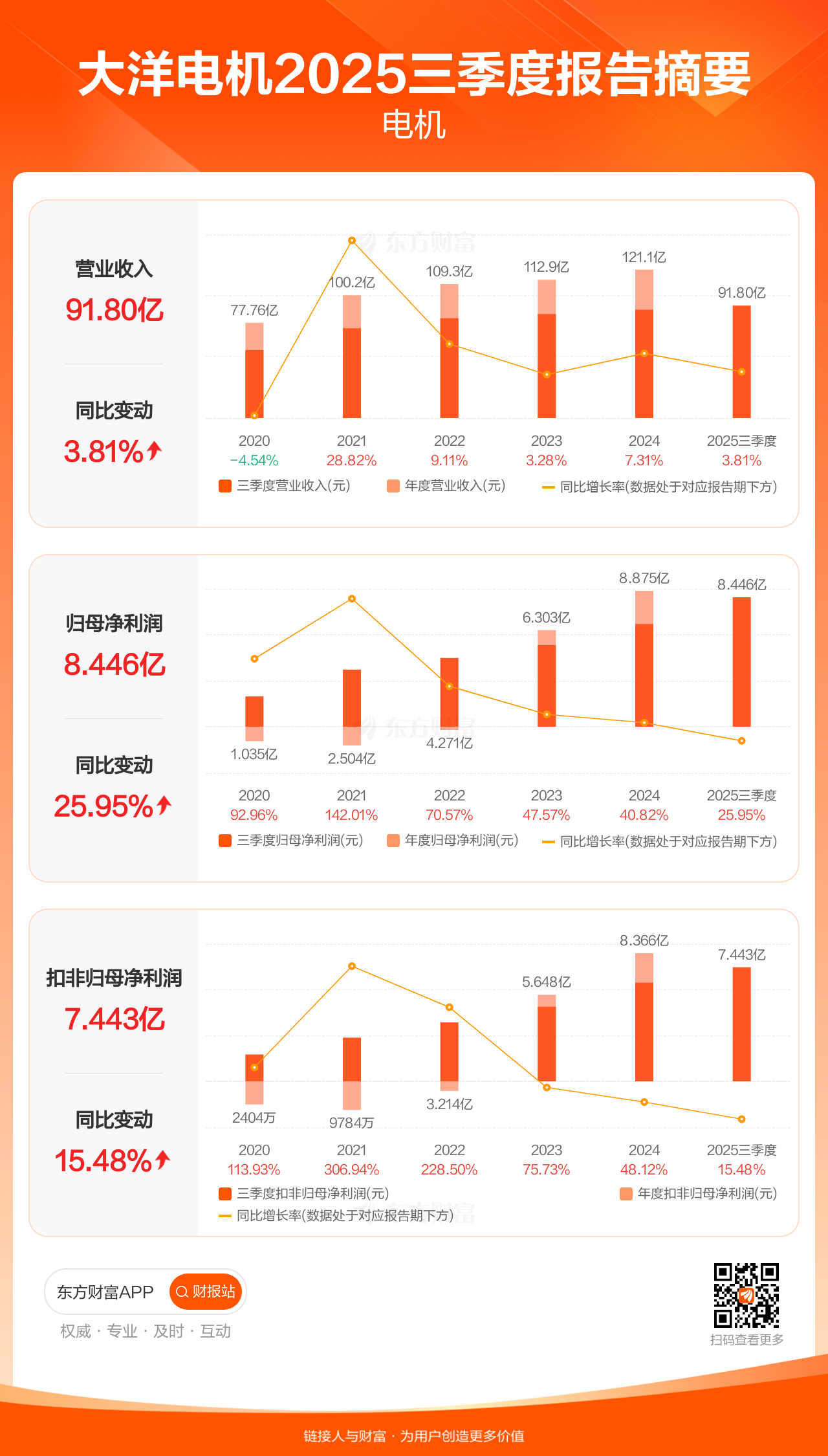 大洋电机10月29日发布2025年三季报显示,公司前三季实现营业收入91.80亿元,同比增长3.81%;归母净利润8.45亿元,同比增长25.95%;扣非归母净利润7.44亿元,同比增长15.48%。