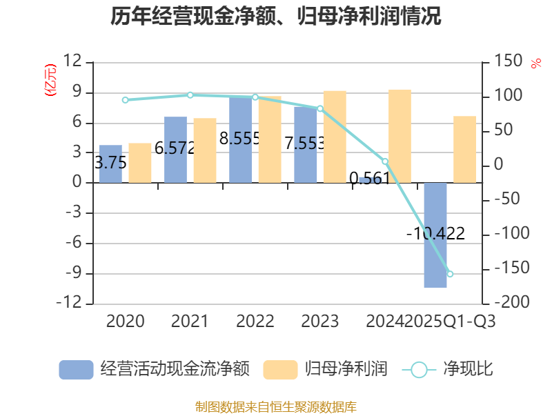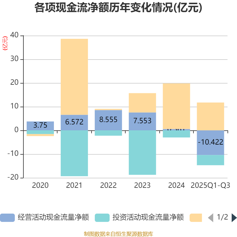 2025年前三季度,公司经营活动现金流净额为-10.42亿元,同比减少9.16亿元;筹资活动现金流净额11.74亿元,同比减少2.81亿元;投资活动现金流净额-4.29亿元,上年同期为1.91亿元。