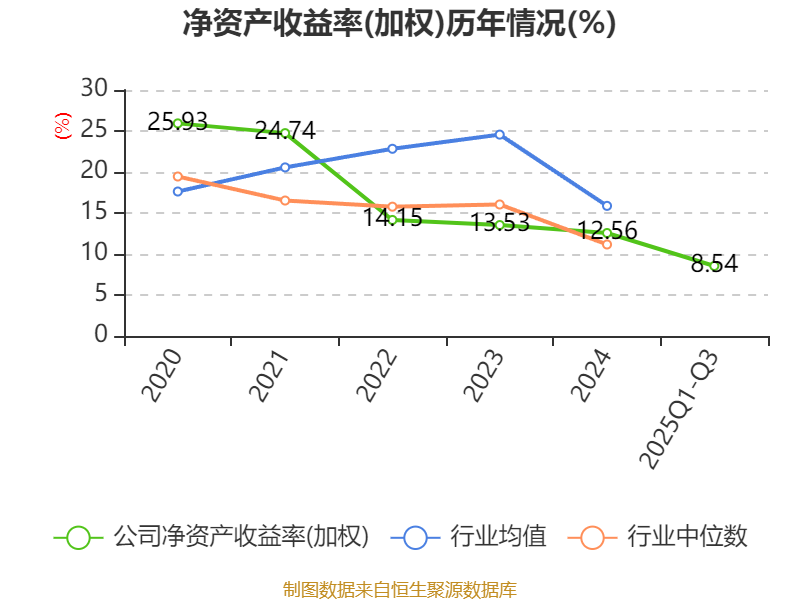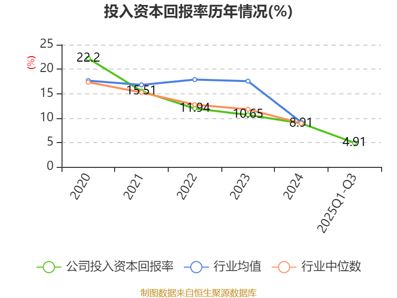 盈利能力方面, 2025年前三季度公司加权平均净资产收益率为8.54%,同比下降1.85个百分点。公司2025年前三季度投入资本回报率为4.91%,较上年同期下降2.88个百分点。