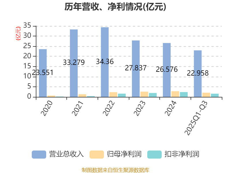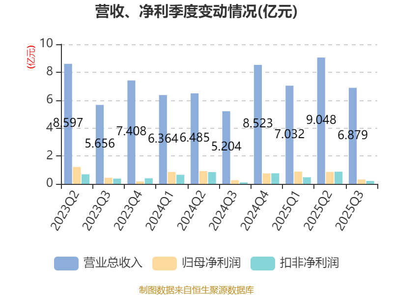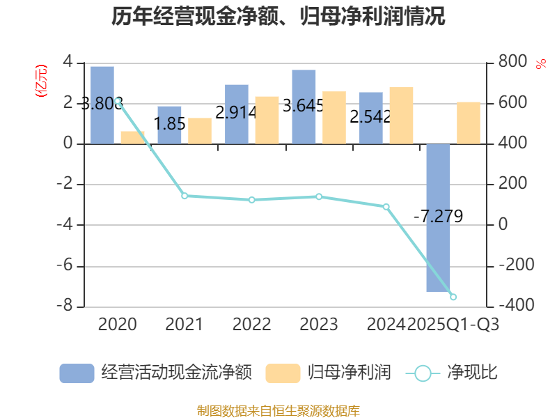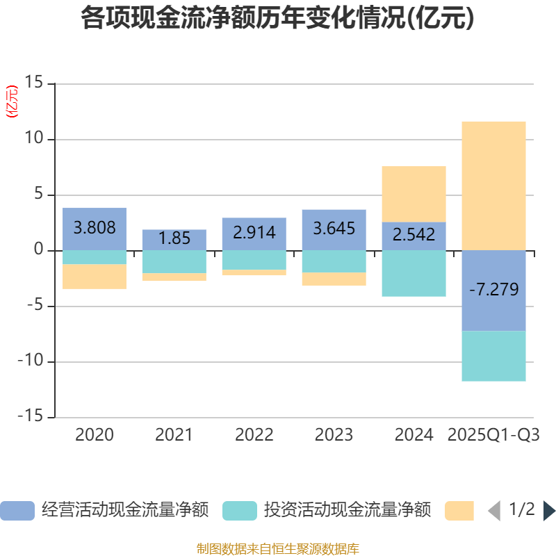 2025年前三季度,公司经营活动现金流净额为-7.28亿元,同比减少6.86亿元;筹资活动现金流净额11.57亿元,同比增加11.75亿元;投资活动现金流净额-4.51亿元,上年同期为-2.05亿元。