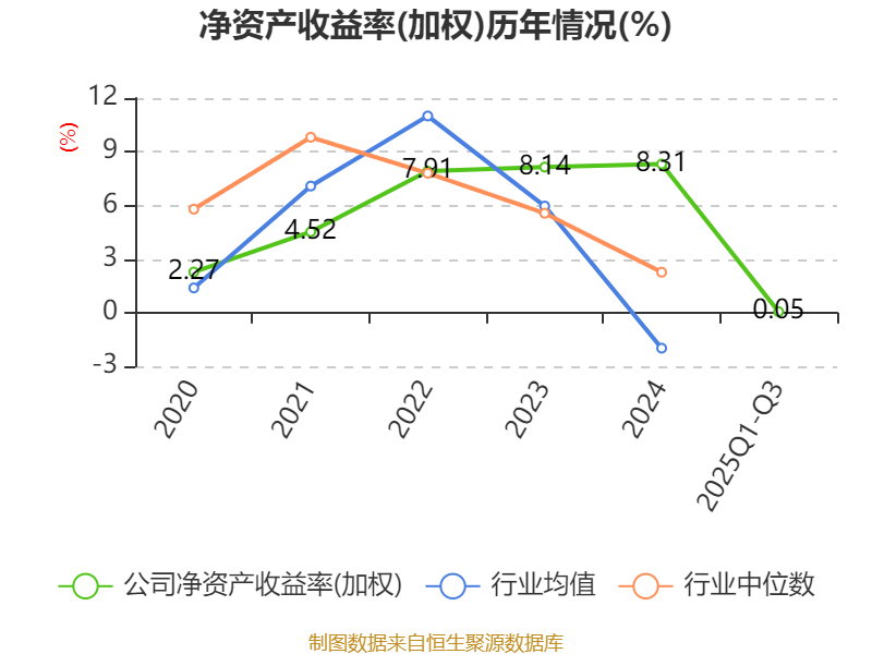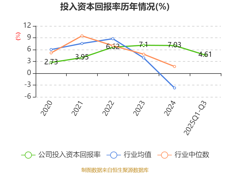 盈利能力方面, 2025年前三季度公司加权平均净资产收益率为0.05%,同比下降6.07个百分点。公司2025年前三季度投入资本回报率为4.61%,较上年同期下降0.64个百分点。