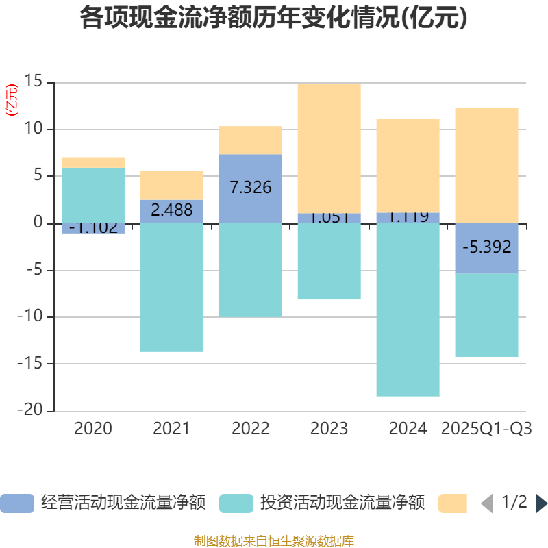 2025年前三季度,公司经营活动现金流净额为-5.39亿元,同比减少4.53亿元;筹资活动现金流净额12.3亿元,同比增加3.47亿元;投资活动现金流净额-8.85亿元,上年同期为-13.19亿元。