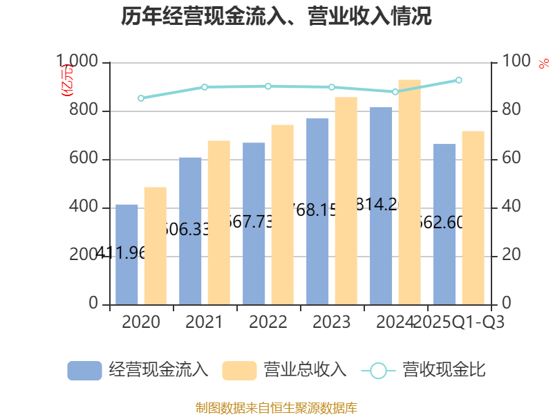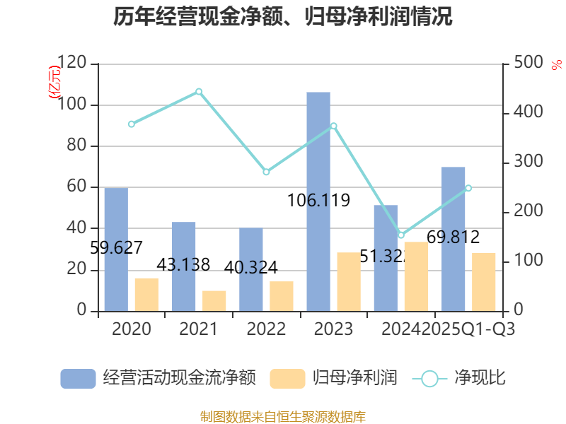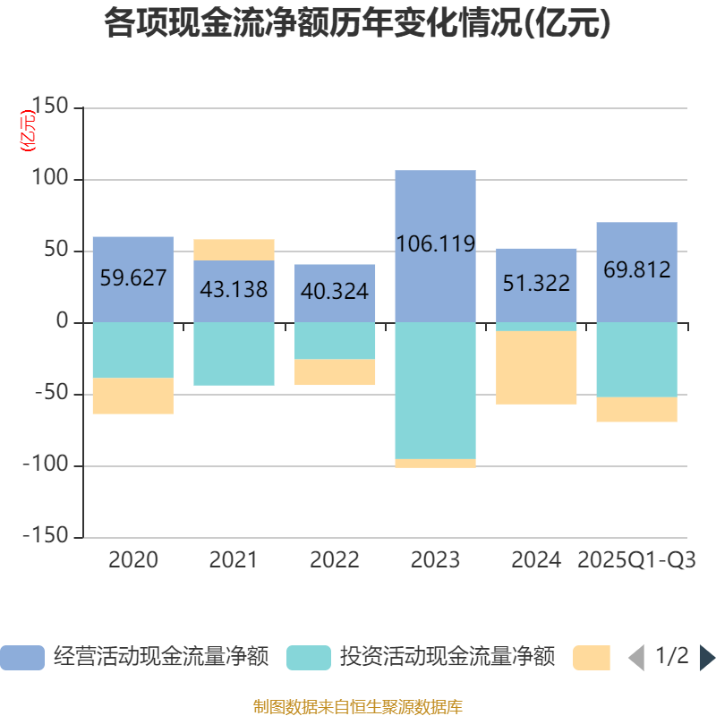 2025年前三季度,公司经营活动现金流净额为69.81亿元,同比增长34.06%;筹资活动现金流净额-17.24亿元,同比增加27.95亿元;投资活动现金流净额-52.39亿元,上年同期为-12.46亿元。
