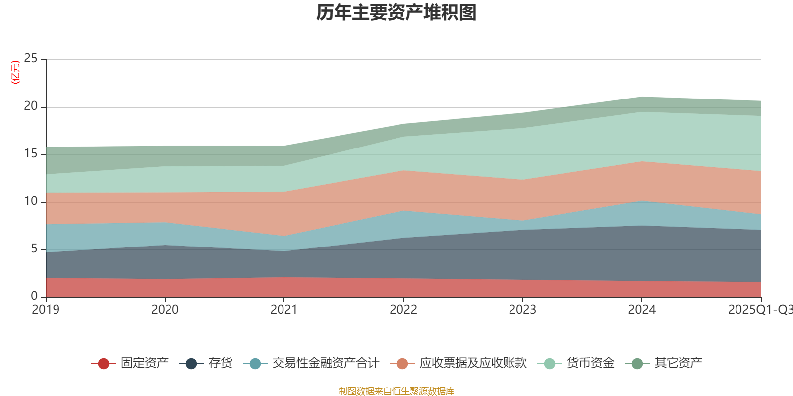 资产重大变化方面,截至2025年三季度末,公司交易性金融资产合计较上年末减少37.33%,占公司总资产比重下降4.45个百分点;货币资金较上年末增加11.22%,占公司总资产比重上升3.38个百分点;应收票据及应收账款较上年末增加9.93%,占公司总资产比重上升2.42个百分点;存货较上年末减少6.13%,占公司总资产比重下降1.13个百分点。