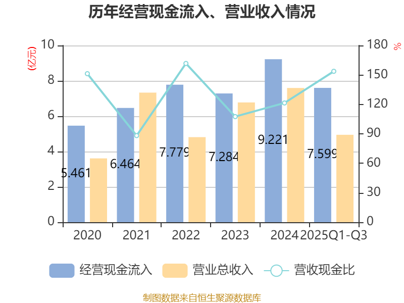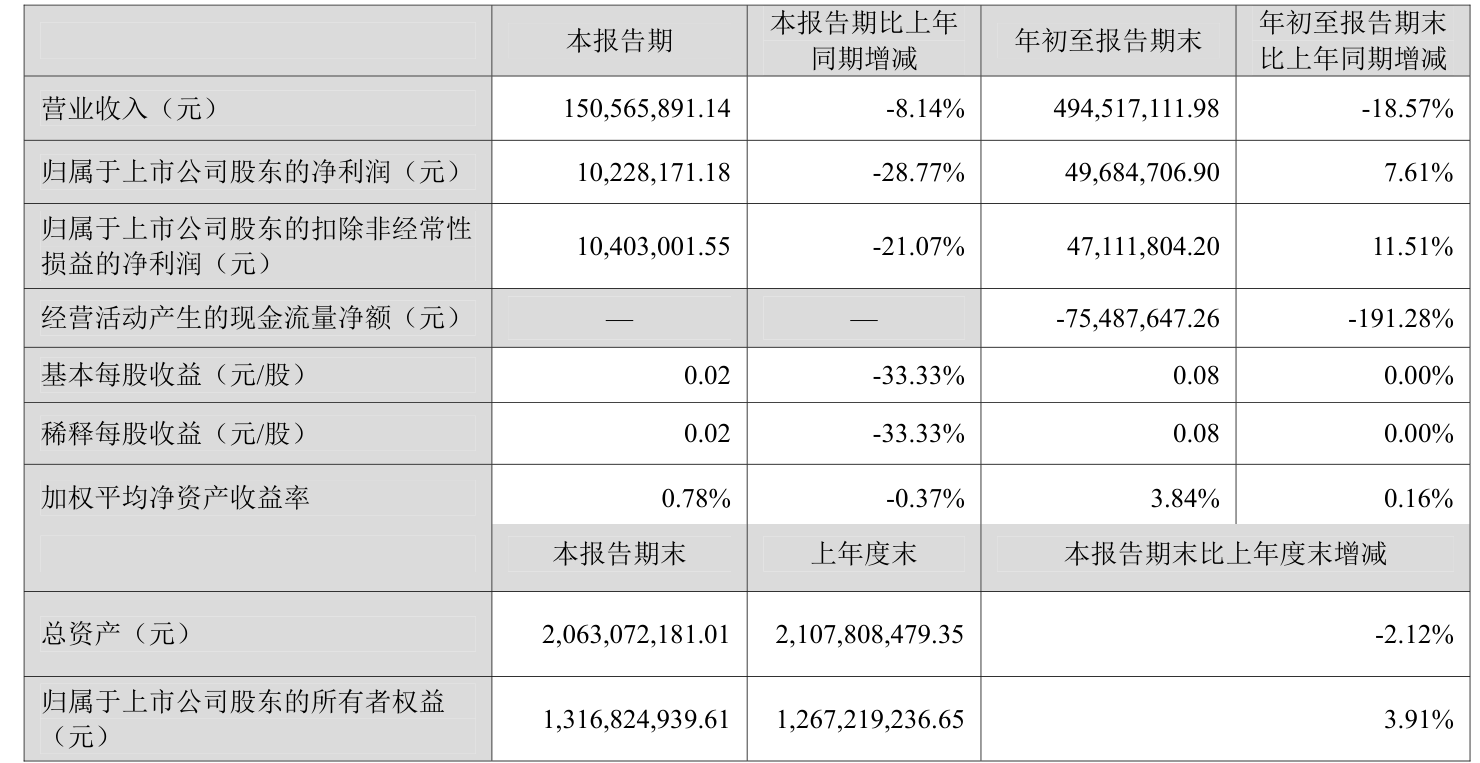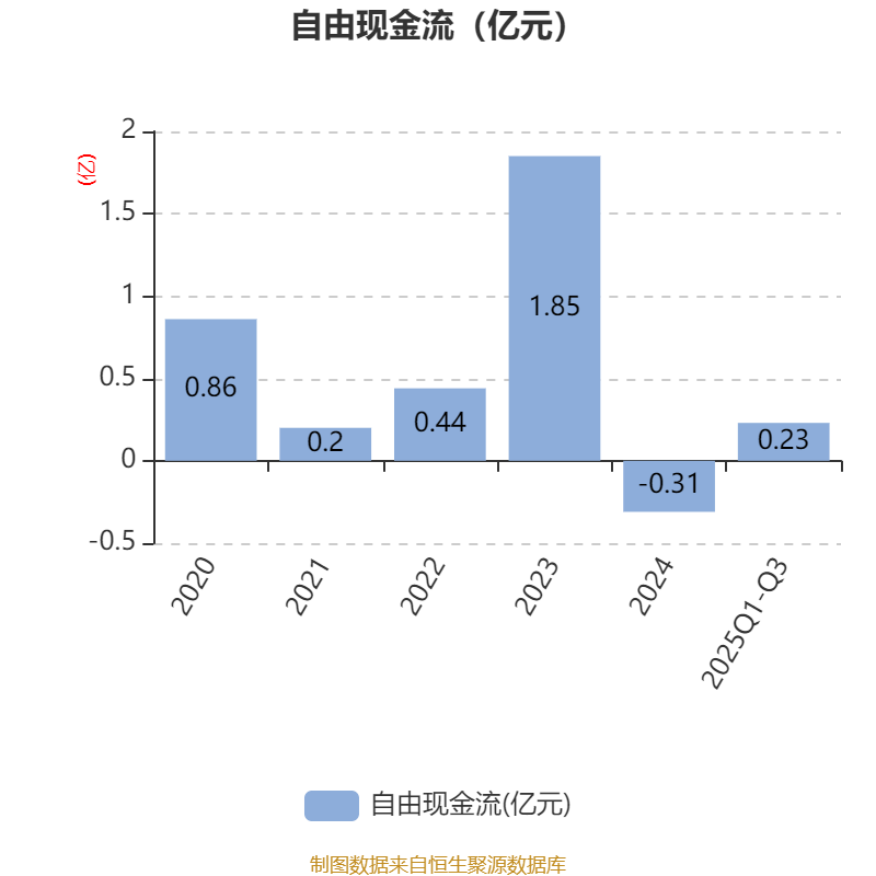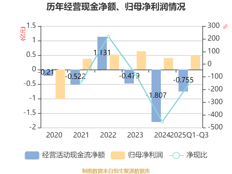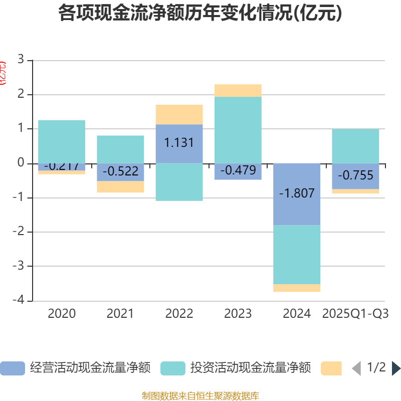 2025年前三季度,公司经营活动现金流净额为-7548.76万元,同比减少1.58亿元;筹资活动现金流净额-1247.28万元,同比增加818.75万元;投资活动现金流净额9939.92万元,上年同期为-3951.4万元。