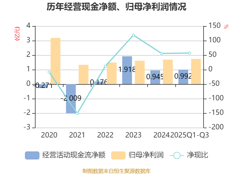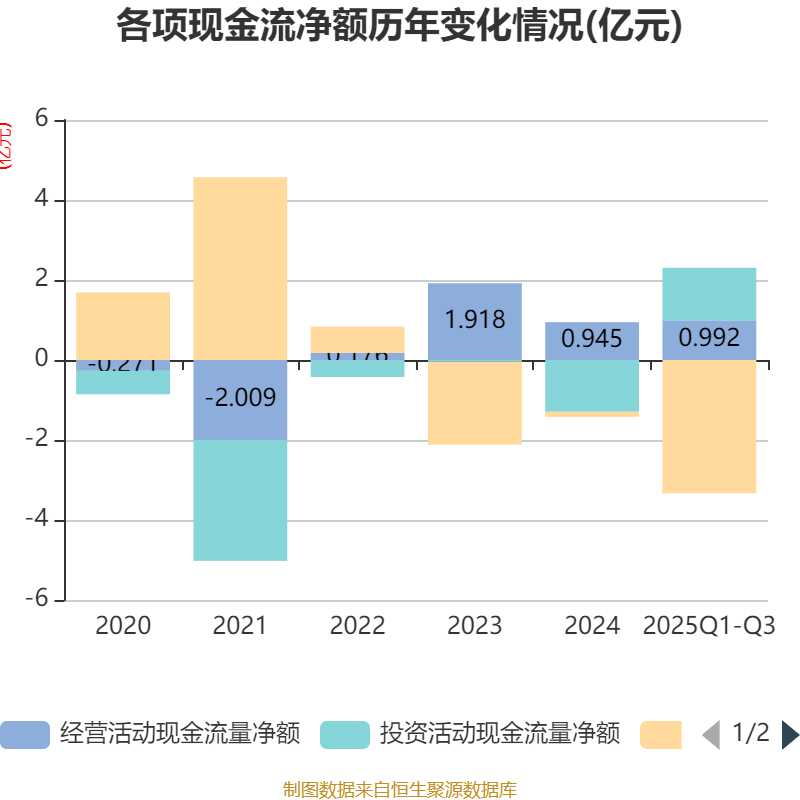 2025年前三季度,公司经营活动现金流净额为9924.68万元,同比增加1.77亿元;筹资活动现金流净额-3.33亿元,同比减少4.18亿元;投资活动现金流净额1.31亿元,上年同期为-1.45亿元。