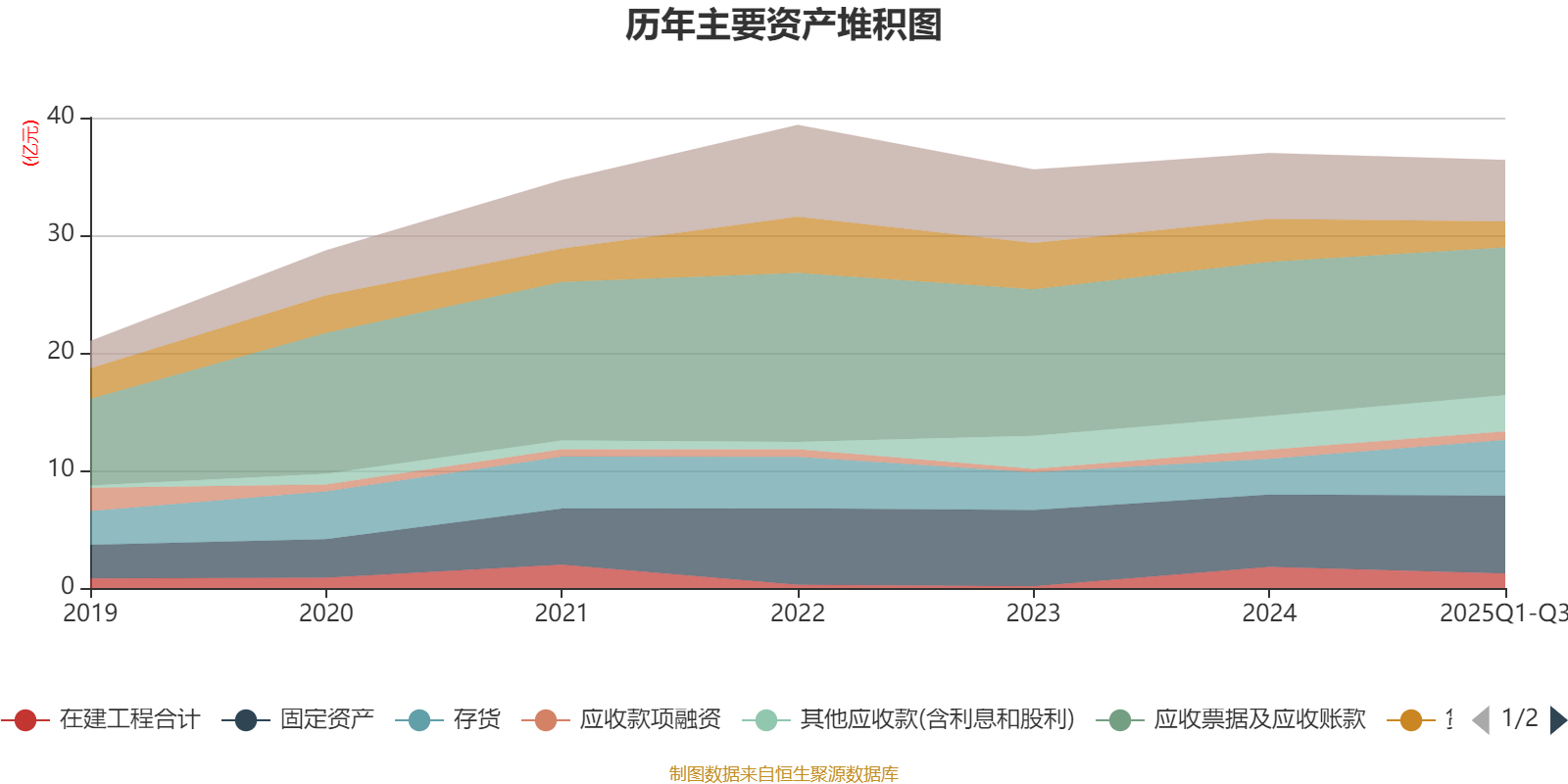 资产重大变化方面,截至2025年三季度末,公司存货较上年末增加55.87%,占公司总资产比重上升4.81个百分点;其他权益工具投资较上年末减少100%,占公司总资产比重下降4.23个百分点;货币资金较上年末减少39.5%,占公司总资产比重下降3.81个百分点;其他流动资产较上年末增加186.78%,占公司总资产比重上升1.91个百分点。