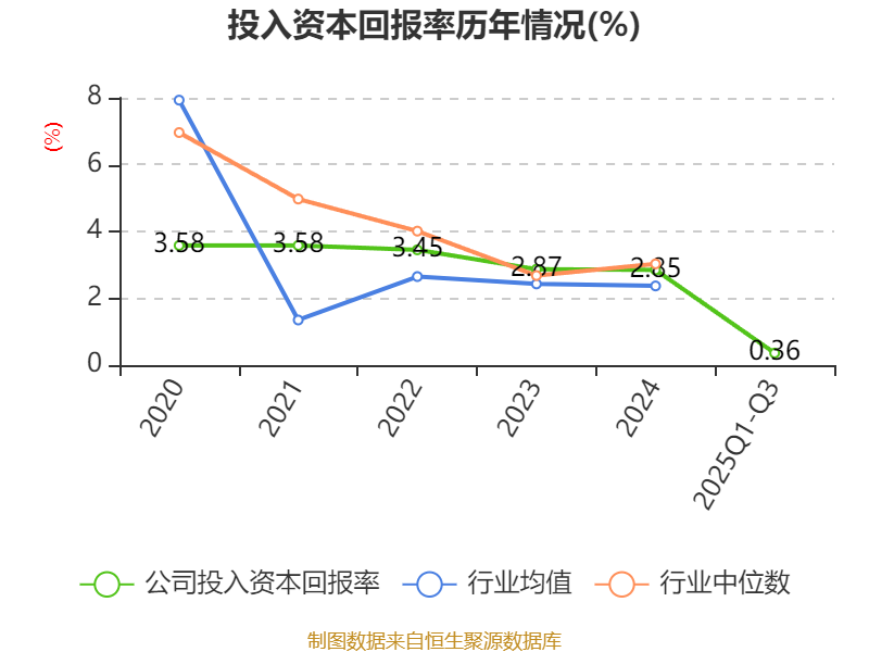 盈利能力方面, 2025年前三季度公司加权平均净资产收益率为-3.15%,同比上升0.58个百分点。公司2025年前三季度投入资本回报率为0.36%,较上年同期下降0.05个百分点。