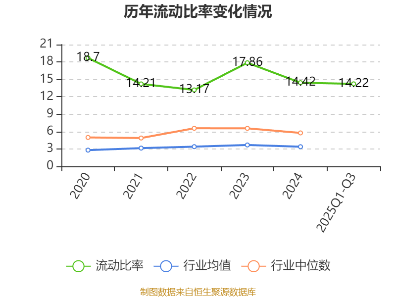 2025年前三季度,公司流动比率为14.22,速动比率为12.44。