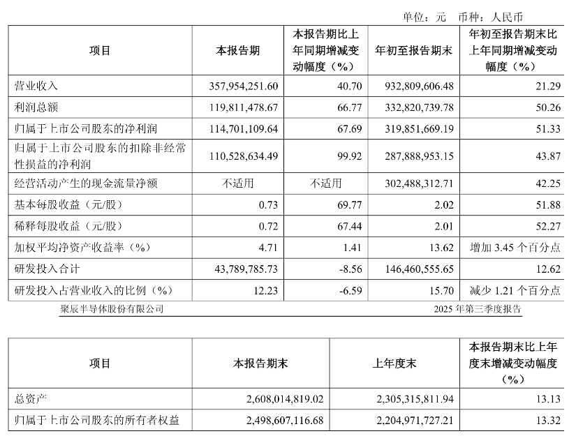 中证智能财讯聚辰股份(688123)10月29日披露2025年第三季度报告。前三季度公司实现营业总收入9.33亿元,同比增长21.29%;归母净利润3.2亿元,同比增长51.33%;扣非净利润2.88亿元,同比增长43.87%;经营活动产生的现金流量净额为3.02亿元,同比增长42.25%;报告期内,聚辰股份基本每股收益为2.02元,加权平均净资产收益率为13.62%。