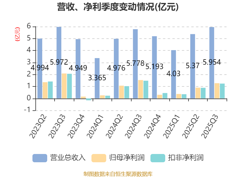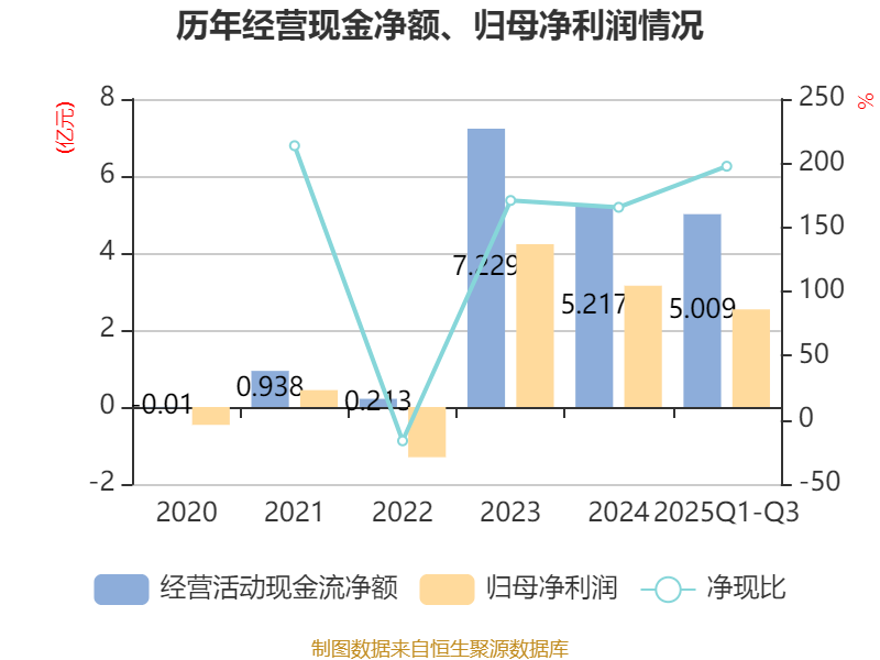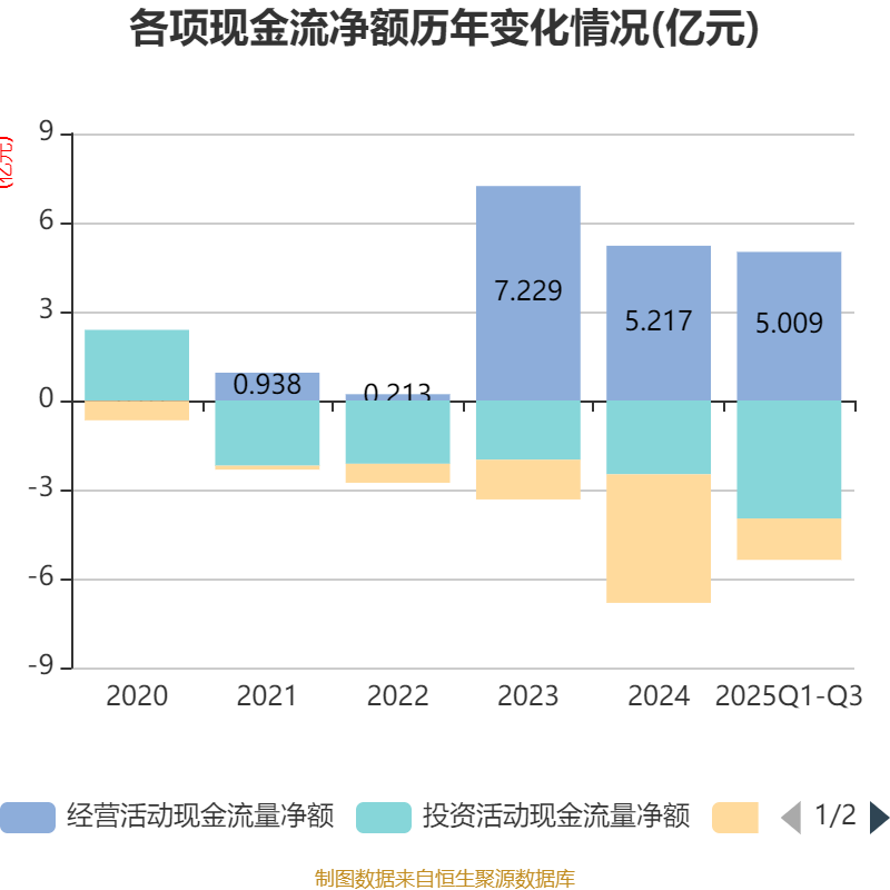 2025年前三季度,公司经营活动现金流净额为5.01亿元,同比增长22.84%;筹资活动现金流净额-1.4亿元,同比增加2.59亿元;投资活动现金流净额-3.98亿元,上年同期为-9.32亿元。