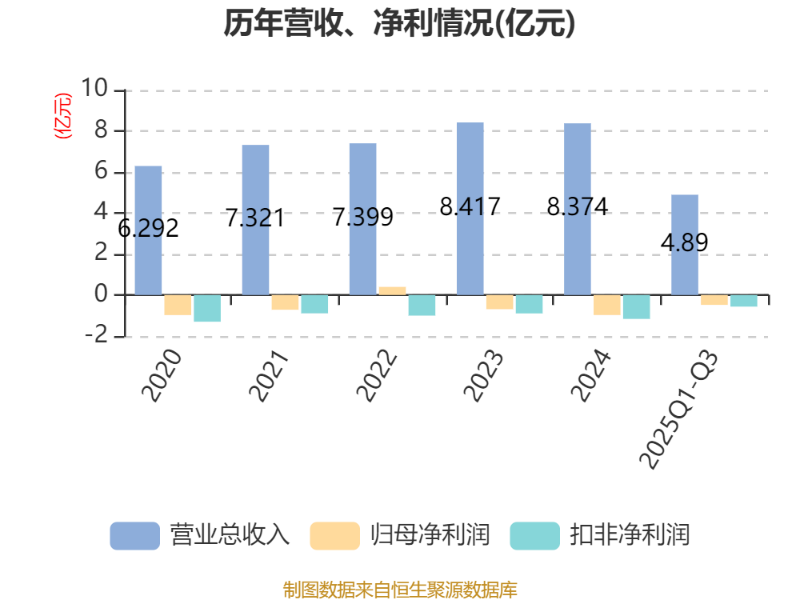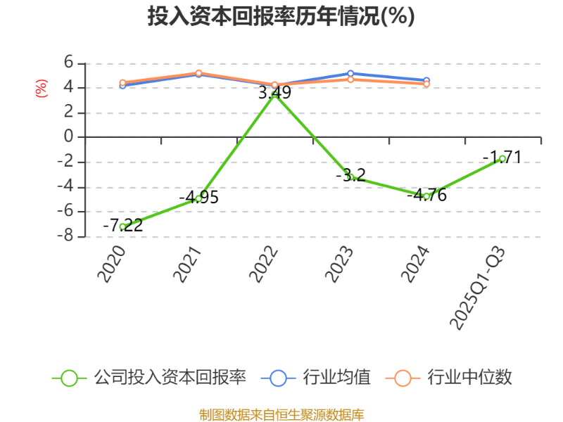 盈利能力方面, 2025年前三季度公司加权平均净资产收益率为-6.11%,同比下降5.45个百分点。公司2025年前三季度投入资本回报率为-1.71%,较上年同期下降2.24个百分点。