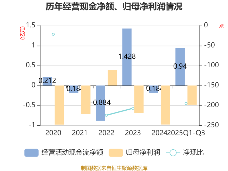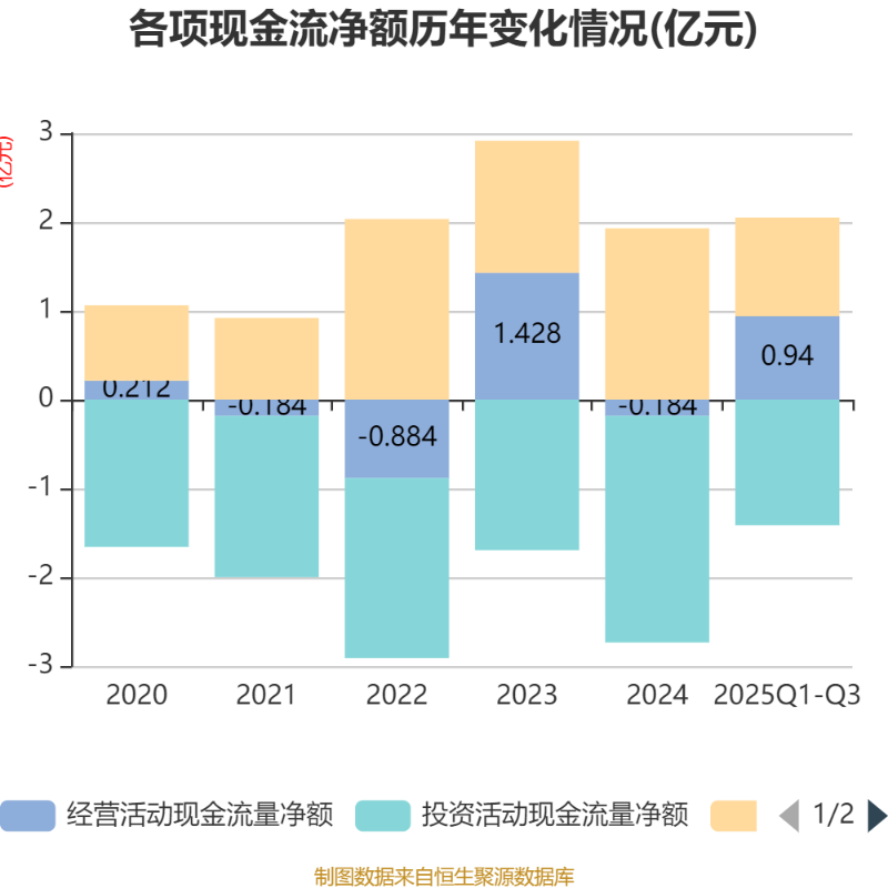2025年前三季度,公司经营活动现金流净额为9403.28万元,同比增长638.54%;筹资活动现金流净额1.11亿元,同比减少2858.41万元;投资活动现金流净额-1.41亿元,上年同期为-1.9亿元。