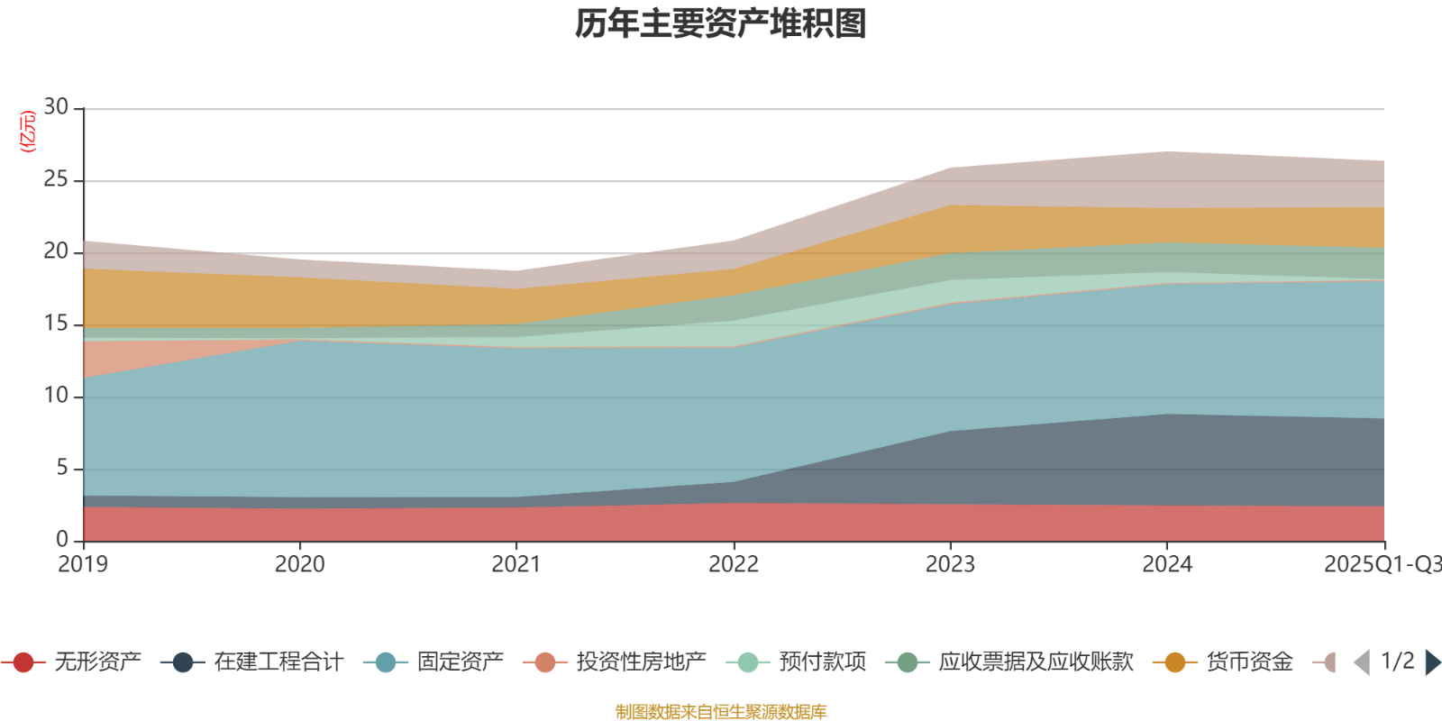 资产重大变化方面,截至2025年三季度末,公司固定资产较上年末增加5.77%,占公司总资产比重上升2.8个百分点;预付款项较上年末减少90.6%,占公司总资产比重下降2.55个百分点;货币资金较上年末增加18.86%,占公司总资产比重上升1.91个百分点;其他应收款(含利息和股利)较上年末减少36.21%,占公司总资产比重下降1.65个百分点。