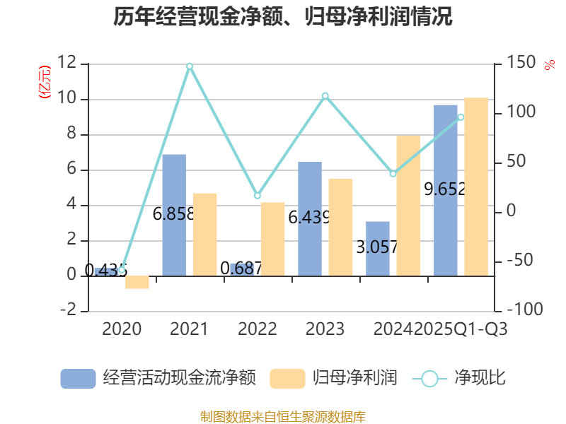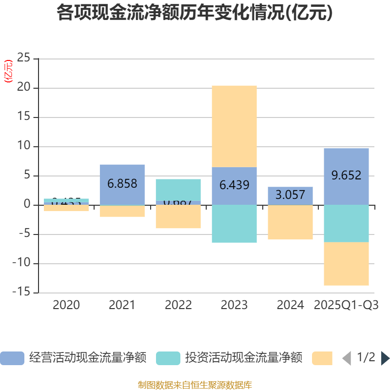 2025年前三季度,公司经营活动现金流净额为9.65亿元,同比增加9.98亿元;筹资活动现金流净额-7.4亿元,同比减少2.7亿元;投资活动现金流净额-6.41亿元,上年同期为-1.19亿元。