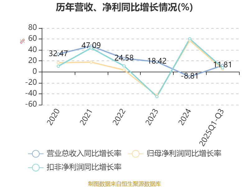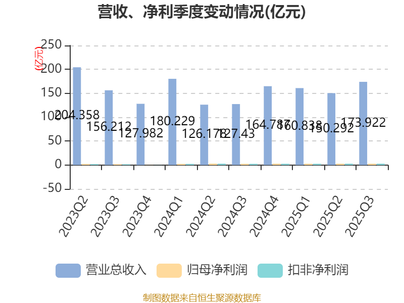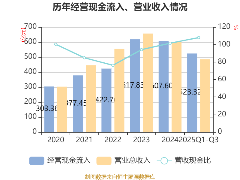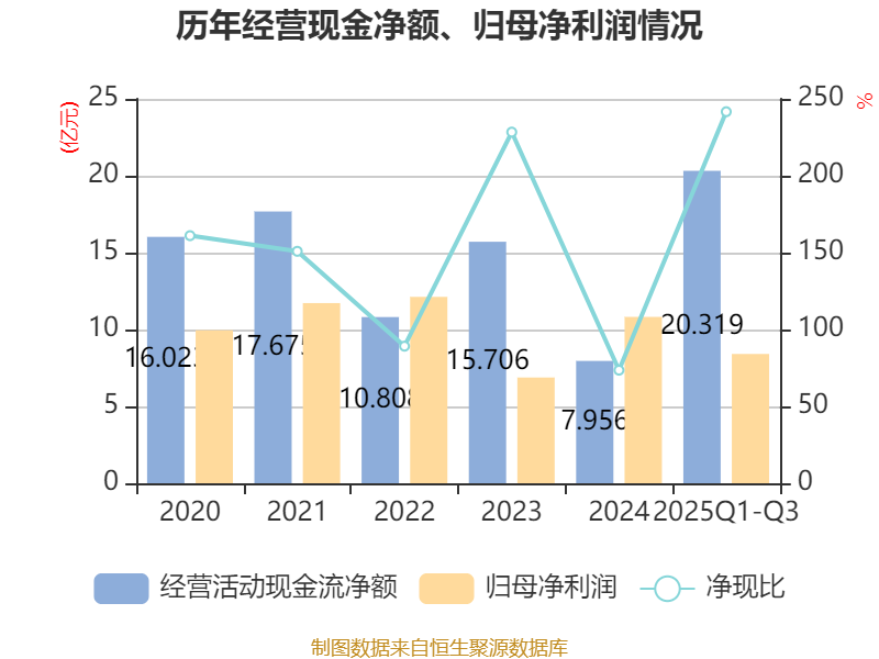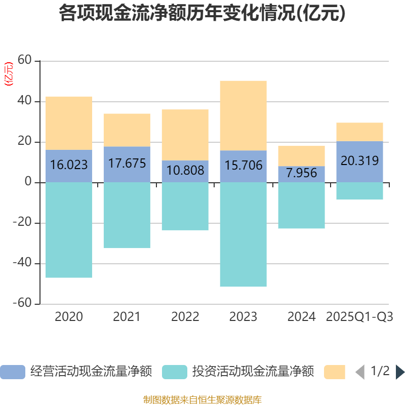 2025年前三季度,公司经营活动现金流净额为20.32亿元,同比增长127.01%;筹资活动现金流净额9.1亿元,同比增加5108.76万元;投资活动现金流净额-8.52亿元,上年同期为-11.85亿元。