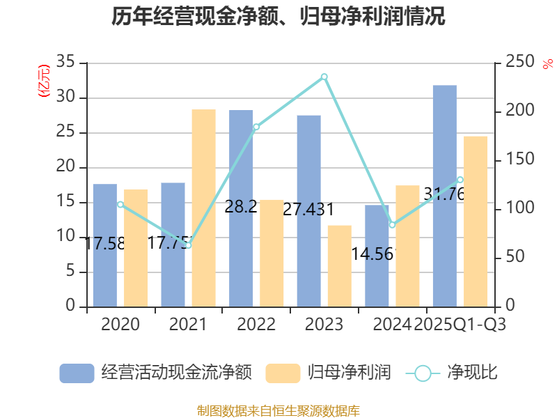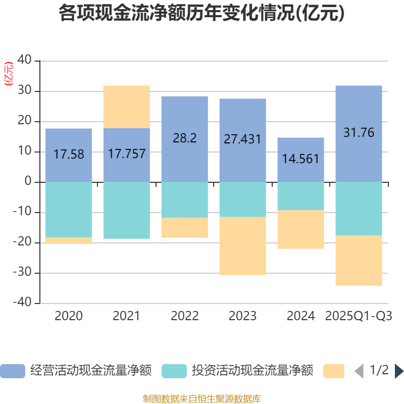 2025年前三季度,公司经营活动现金流净额为31.76亿元,同比增长181.28%;筹资活动现金流净额-16.55亿元,同比减少7.34亿元;投资活动现金流净额-17.76亿元,上年同期为-11.08亿元。