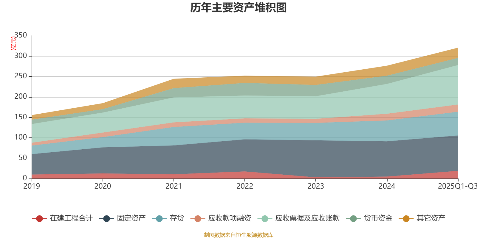 资产重大变化方面,截至2025年三季度末,公司固定资产较上年末增加0.36%,占公司总资产比重下降4.19个百分点;在建工程合计较上年末增加298.63%,占公司总资产比重上升4.14个百分点;应收票据及应收账款较上年末增加32.18%,占公司总资产比重上升3.71个百分点;货币资金较上年末减少12.91%,占公司总资产比重下降1.81个百分点。