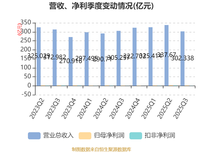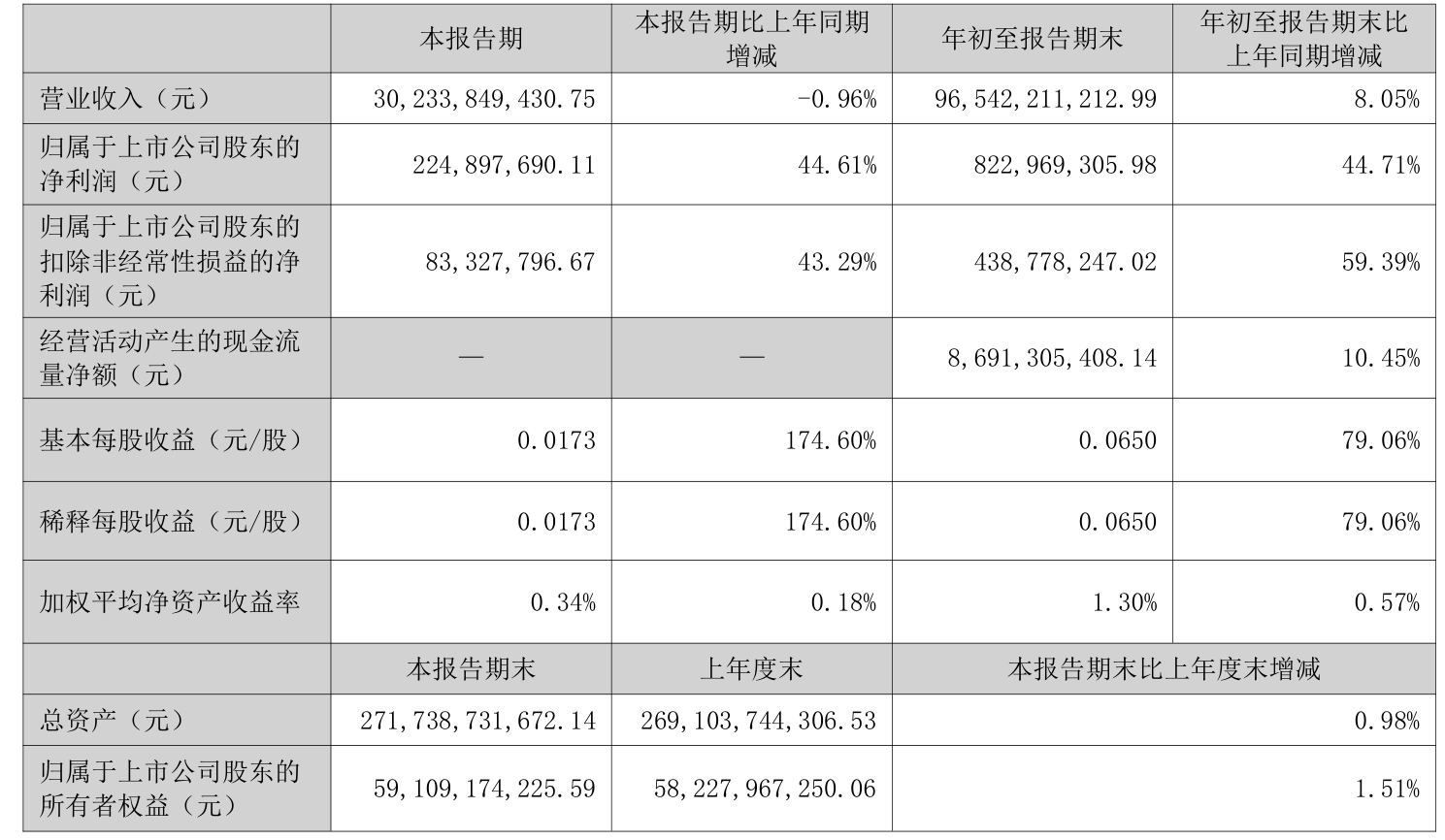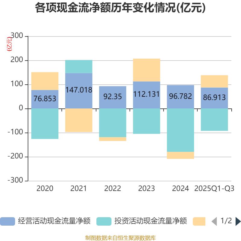 2025年前三季度,公司经营活动现金流净额为86.91亿元,同比增长10.45%;筹资活动现金流净额51.08亿元,同比增加55.78亿元;投资活动现金流净额-92.92亿元,上年同期为-112.84亿元。