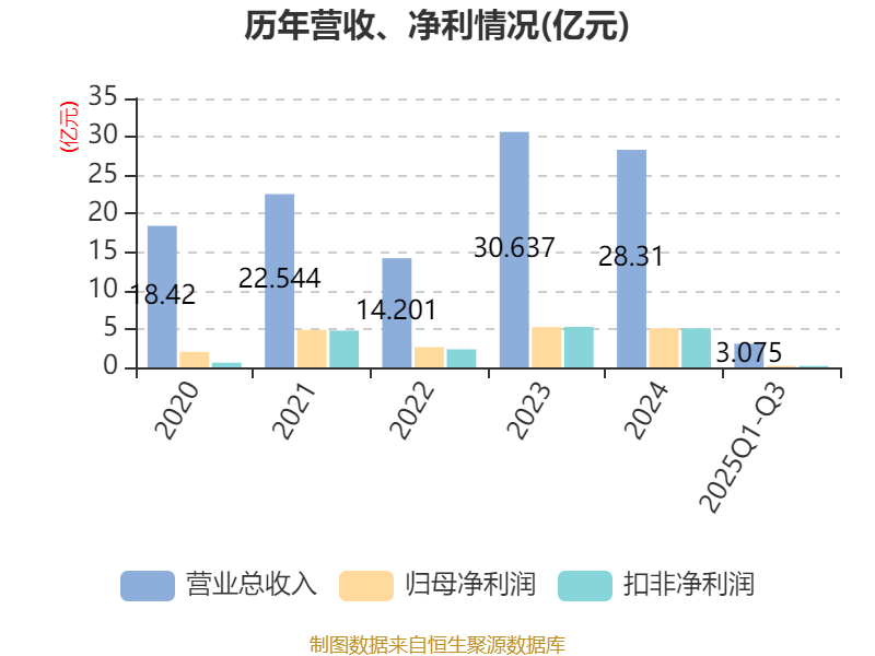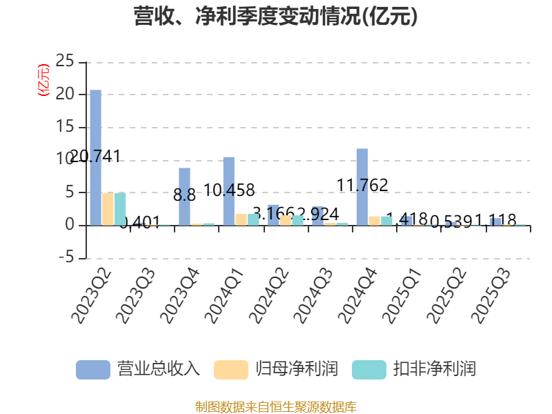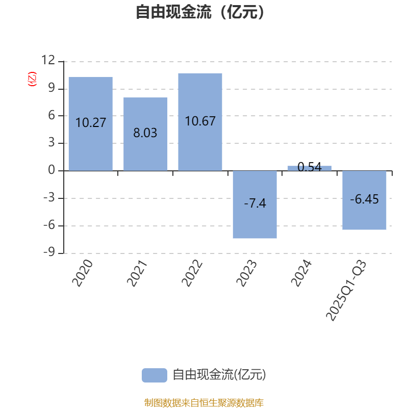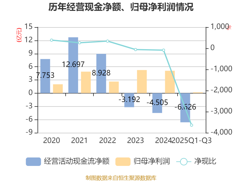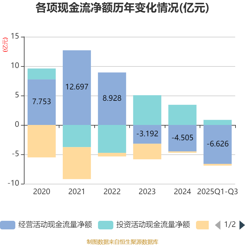 2025年前三季度,公司经营活动现金流净额为-6.63亿元,同比减少5.6亿元;筹资活动现金流净额-2888.78万元,同比减少1117.26万元;投资活动现金流净额8615.56万元,上年同期为2.24亿元。