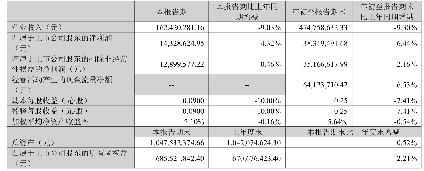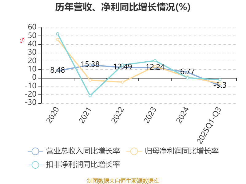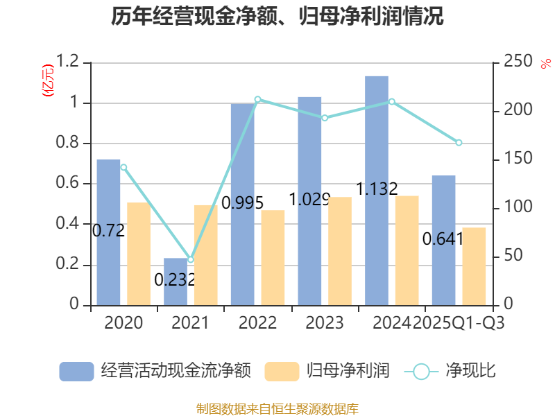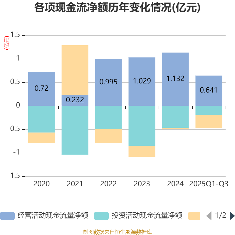 2025年前三季度,公司经营活动现金流净额为6412.37万元,同比增长6.53%;筹资活动现金流净额-2803.44万元,同比减少755.83万元;投资活动现金流净额-1955.46万元,上年同期为-2785.73万元。